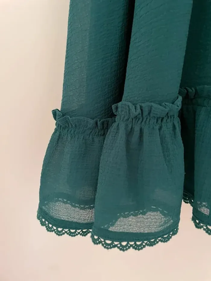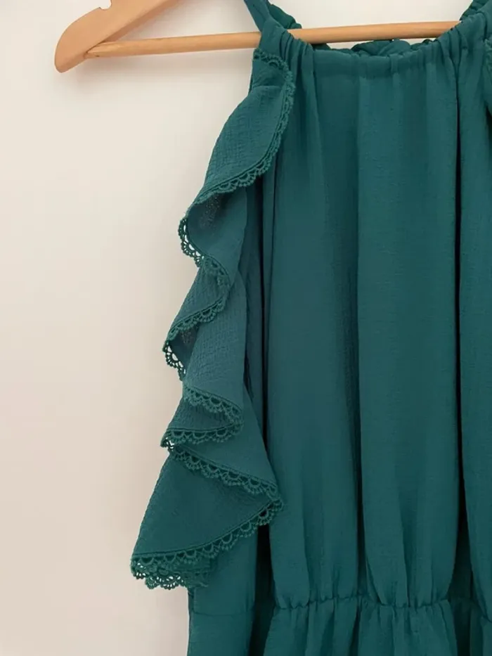 Détails féminins avec volants, bas à froufrous, et dos ouvert avec un nœud élégant au niveau de la nuque.