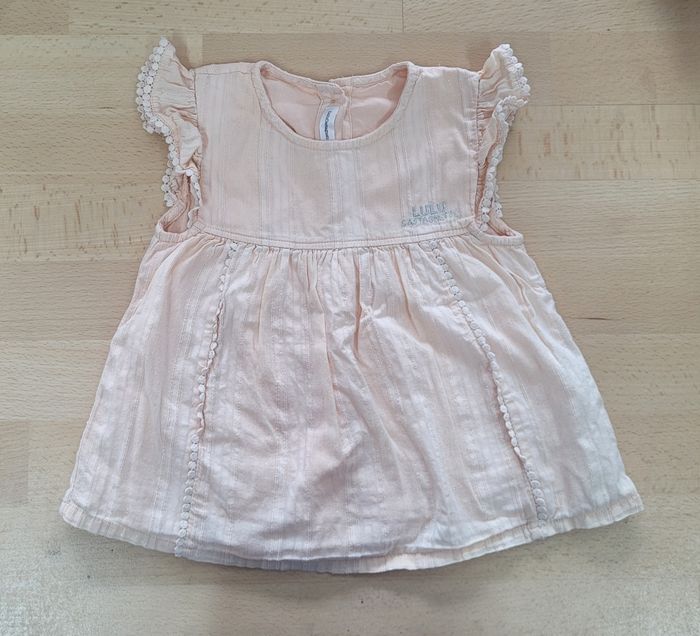 T-shirt manches courtes, avec froufrous et inscription, de couleur abricot et fil argenté, de la marque Lulu Castagnette, taille 3 ans, en très bon état. Article lavé pour la vente.