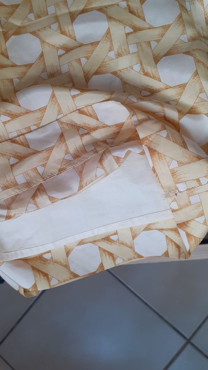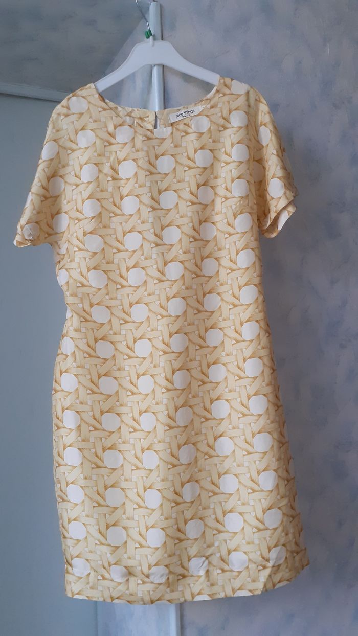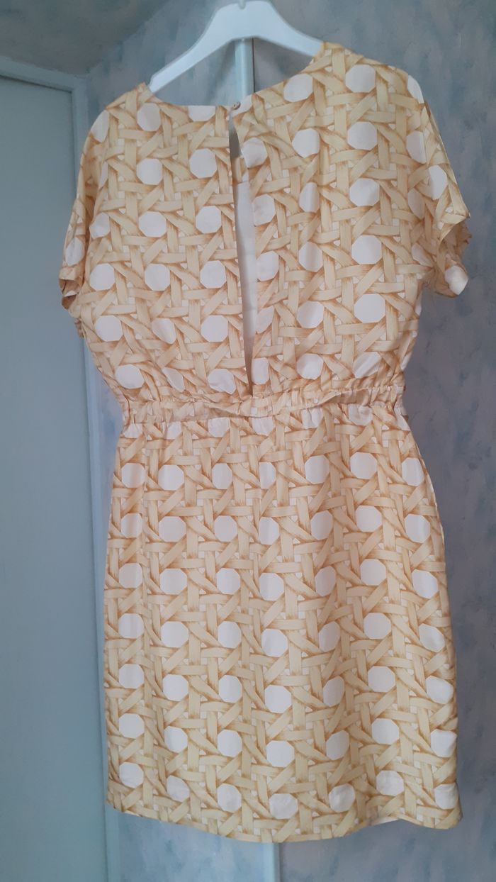 Vends une robe manches courtes, 100 % soie, fendue dans le dos, doublée sur la jupe, élastique plat au niveau de la ceinture dans le dos, couleur jaune et moutarde (la photo ne rend pas bien la couleur), marque Nice Things, taille 36. Longueur de l'épaule à la base : 90 cm Largeur aisselle à aisselle : 44 cm Largeur au niveau des hanches : 48 cm.