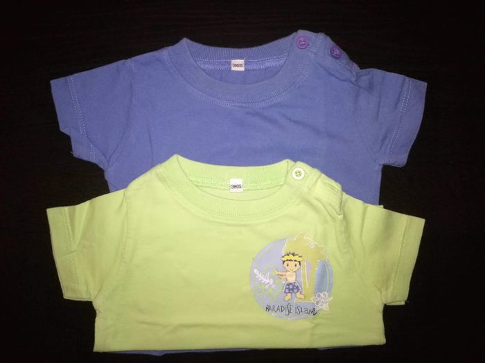 Lot de 2 t-shirts manches courtes bébé avec un bleu et une vert qui a un petit dessin en haut à gauche. Taille 3 mois