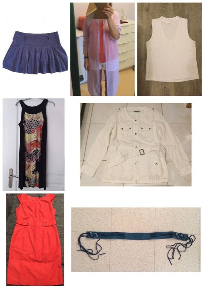 - robe noire avec motif imprimé sur le devant, 3€. - débardeur blanc Jennyfer, 3€. - chemisier long transparent couleur parme. 3€. - robe fourreau rouge Bodyflirt, doublée, tissu doux. 8€. - veste écrue cache-cache, avec ceinture, poches fermées par pressions dorées. 10€. - mini jupe violette en velours fin, 3€. - ceinture en jean a nouer, 2€. En très bon état. Achat à l’unité possible au prix indiqué. 30€ si achat du lot complet. Maison non fumeur et sans animaux. Articles nettoyés avant envoi et emballés avec soin. N’hésitez pas à regarder mes autres ventes, je vends des vêtements enfant en différentes tailles, des chaussures, des jouets, des livres, des DVD etc... Achetez en lot pour rentabiliser les frais d’envoi. Je mets régulièrement de nouvelles annonces.