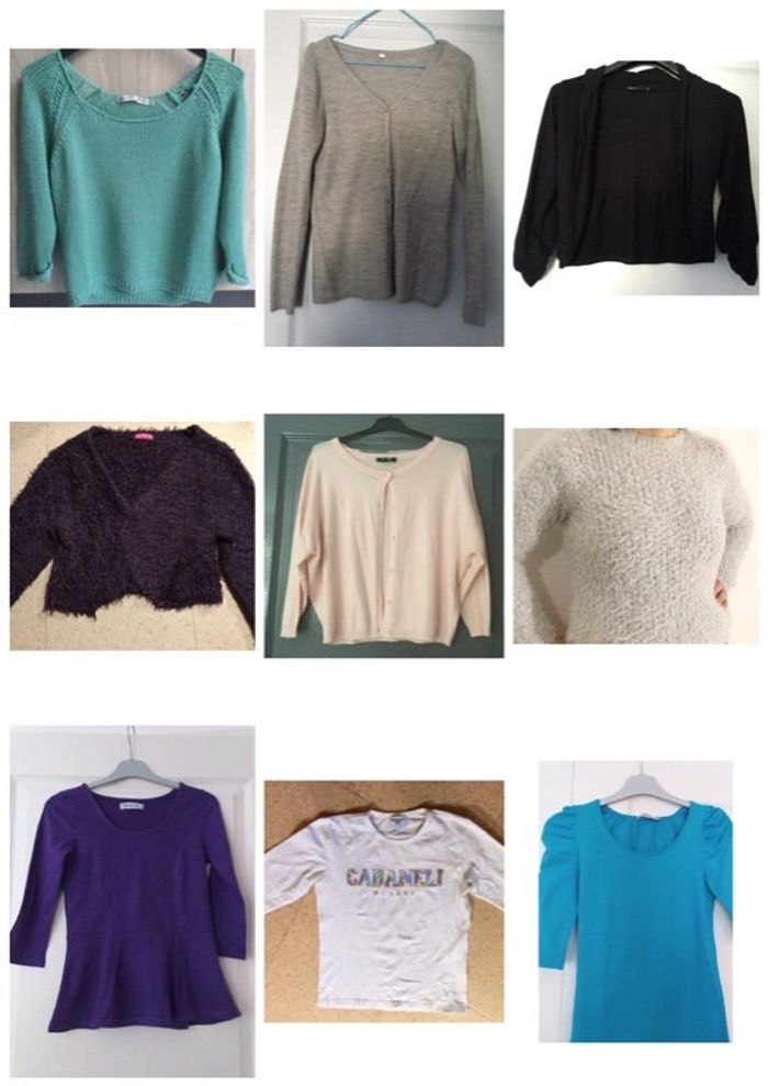 Lot de vêtements Taille 36 : - gilet rose clair Jennifer en très bon état, 3€. - pull vert, maille légère, ajourée par endroits, manches 3/4, en très bon état. 3€. - gilet gris clair en très bon état, 2€. - gilet boléro prune, tissu façon peluche, en très bon état. 2€. - pull doux gris brillant Jennyfer en très bon état. 3€. - t shirt manches longues Cabaneli. 3€. - haut manches 3/4 turquoise. 3€. - haut violet volanté en bas. 3€. - gilet court noir, etat correct. 2€. Achat à l’unité au prix indiqué. 22€ si achat du lot complet. Maison non fumeur et sans animaux. Articles emballés avec soin. Les frais d’envoi font augmenter le prix total, aussi rentabilisez les frais d’envoi en achetant en lot. Je vends des vêtements et chaussures femme et enfant en différentes tailles, des jouets, des livres, des DVD et beaucoup d’autres choses. Je mets régulièrement de nouvelles annonces.