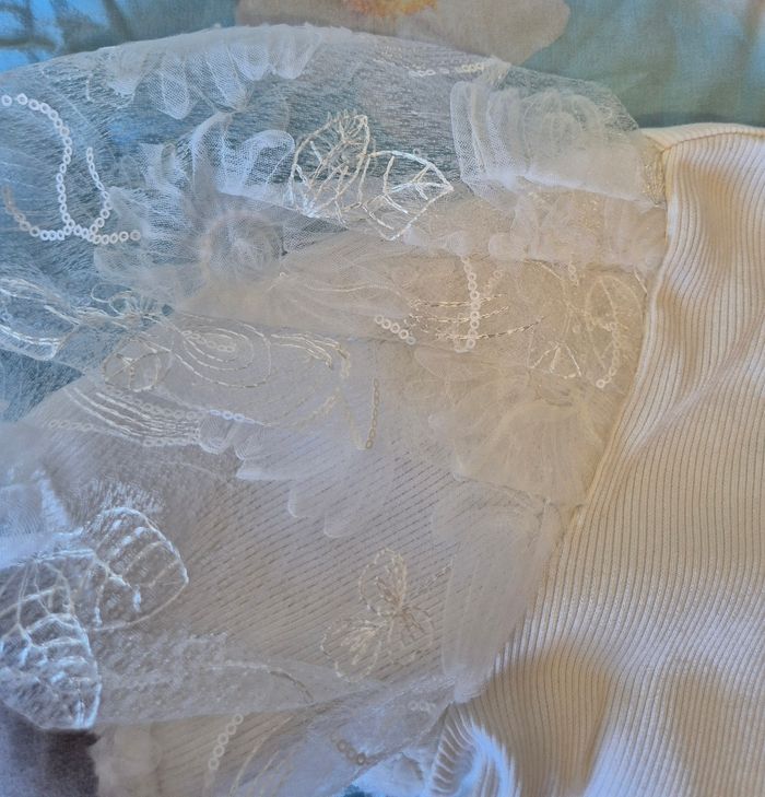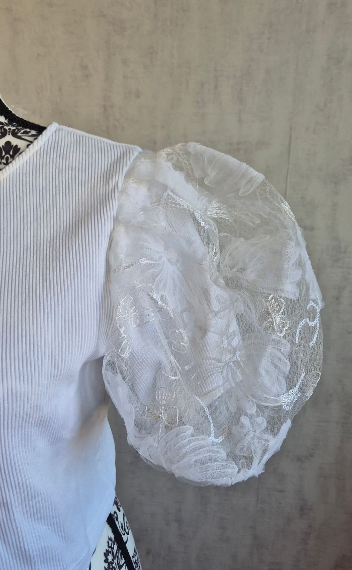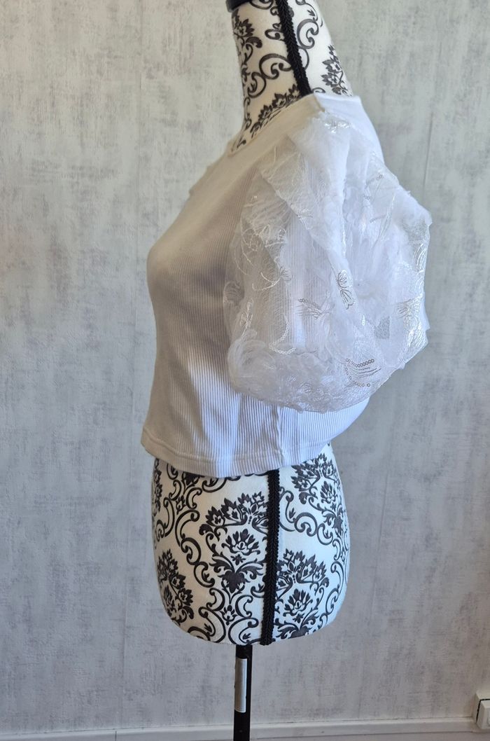 Zara T-shirt top blanc manches courte bouffantes en dentelle taille 36/S - photo numéro 7
