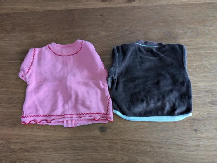 1 gilet rose à fermeture éclair et un sweat en velours, taille 3 mois, en très bon état. Marques "Tout Simplement" et "Barbouillage".