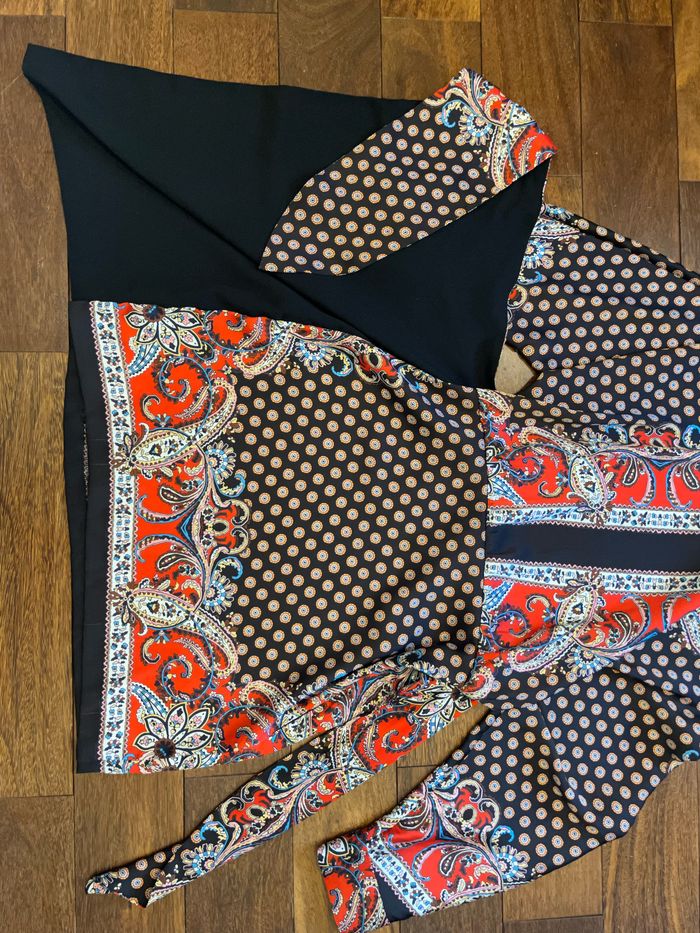 • Robe courte à col rond et manches longues. Jupe style paréo avec nœud. Fermeture à l'arrière avec fente et bouton et zip invisible sur la couture sur le côté. Boutons sur les manches. Couleur noir, rouge, blanc . En parfait état • zara taille xs/34 •84 cm de longueur, 32 cm entre les aisselles • me demander pour une photo portée sur mannequin zara
