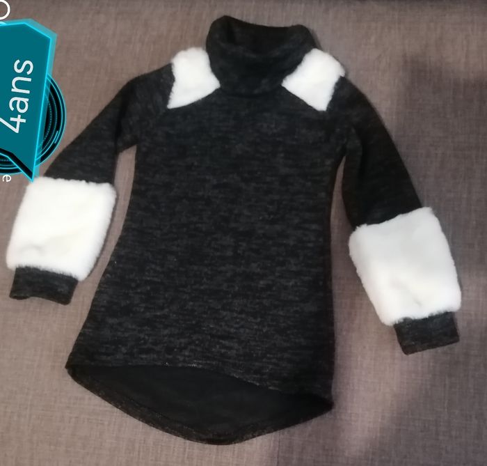 Robe fille manche longue, taille 4ans. Coll roulé Fausse forrure niveau manche et épaule. Devant courte derrière peut longues. 100% polyester. Neuf jamais porté. 10€