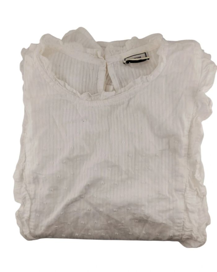 🪧 𝔻𝕖𝕤𝕔𝕣𝕚𝕡𝕥𝕚𝕠𝕟 : Blouse en plumetis, doublée avec volant et fermeture par bouton au niveau de la nuque.