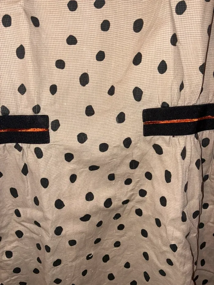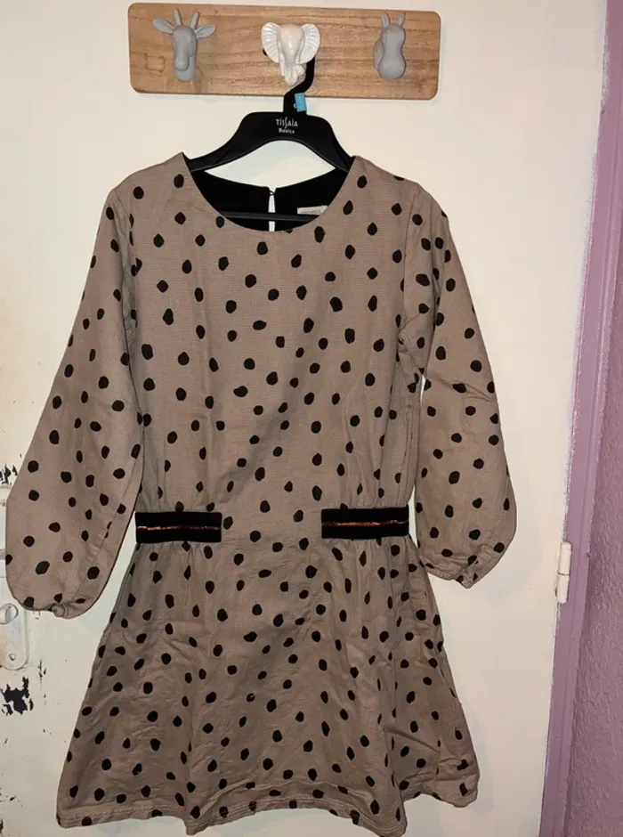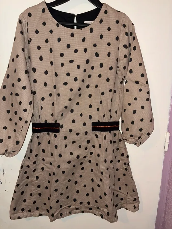 Robe beige à pois noirs, taille 10 ans, Orchestra. Élastiquée à la taille par élastique avec une rayure couleur bronze métallique. Porté plusieurs fois, en bon état.