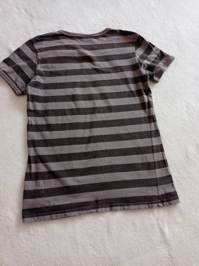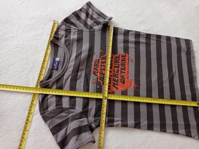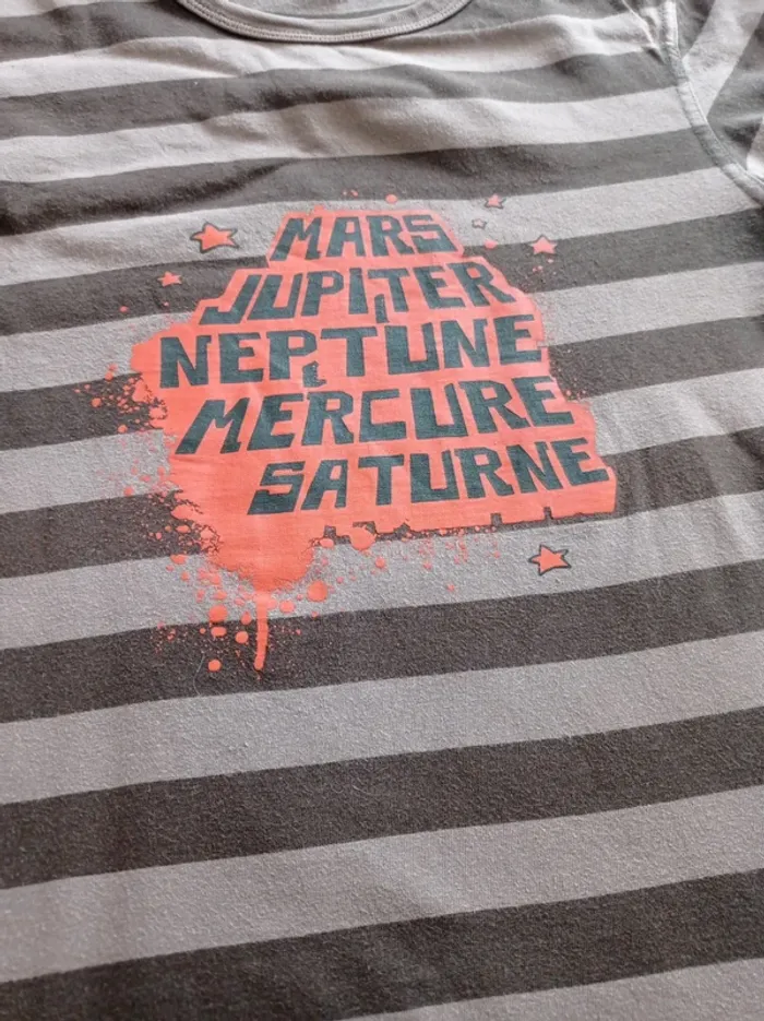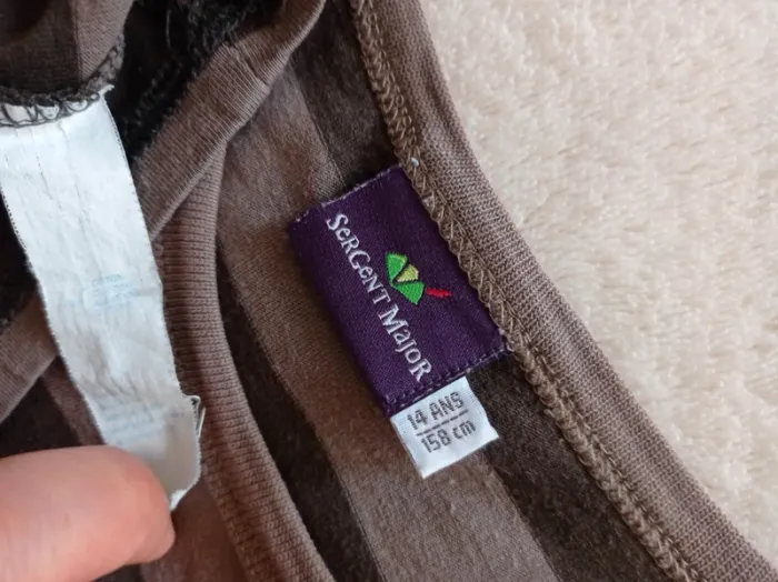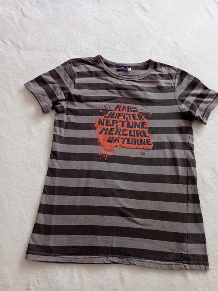 T-shirt manches courtes,rayé en 2 tons de marron et motif orange en très bon état. Marque: Sergent Major Taille : 14 ans Mesures approximatives Longueur: 58cm Épaule à épaule: 36cm Aisselle a aisselle: 40cm En coton. Autres articles en #dresarenfant 😉 #tshirtsergentmajor #sergentmajor #tshirt14ans #tshirtsergentmajor14ans