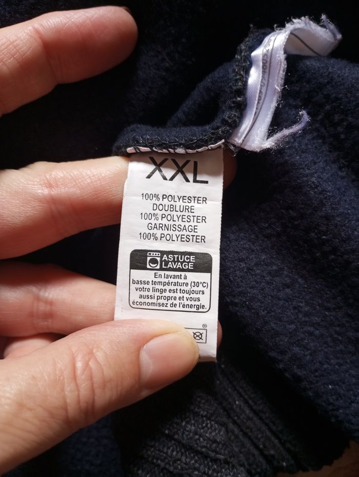 Veste sans manche zippée, noire, doublée polaire bleue marine. Très bon état général même si présence de quelques bouloches. Largeur à plat au niveau du torse : 60cm, longueur depuis le dessus de l'épaule : 73cm environ.
