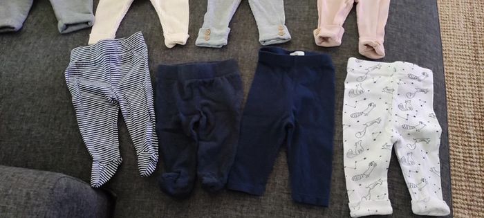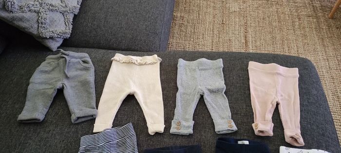 Lot de 7 legging et 1 jogging pour bébé Taille 1 mois (voir Tailles exactes dessous) - Jogging gris La redoute 1 mois - legging beige Vertbaudet 1 mois 54cm - deux legging gris et rose Action 50/56cm - un bleu La redoute. 54cm - un blanc à motif sans étiquette mais je pense la redoute. 54cm - deux avec pied Zeeman 50cm Le tout est quasiment neuf car porté une fois voir pas du tout #bebefille1moislauriem90