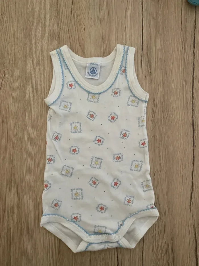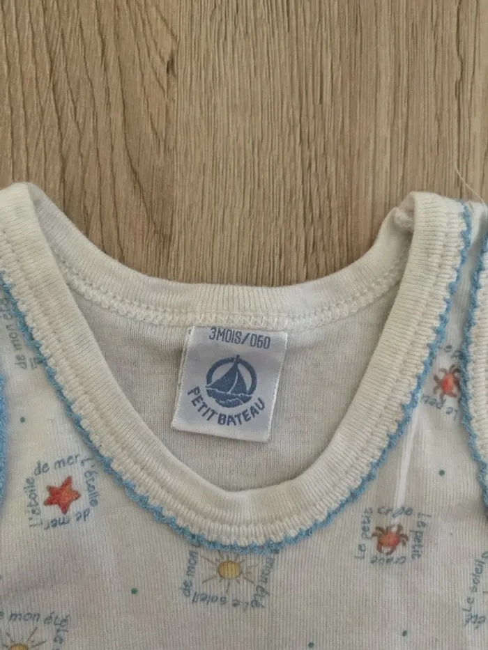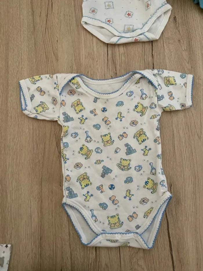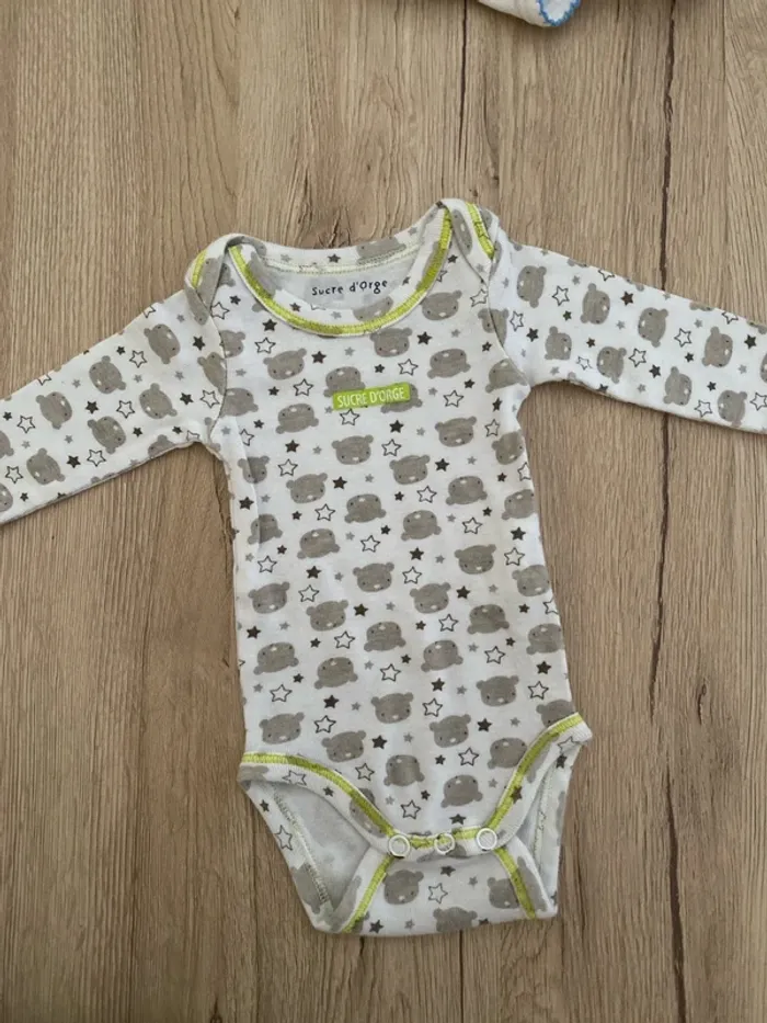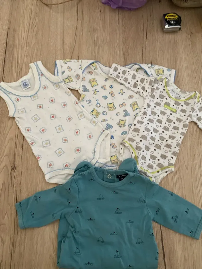 Vends 2 bodies manche courte taille 3 mois 1 pyjama fin taille 1 mois 1 bodie manche longue 1 mois Différentes marques