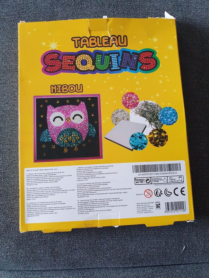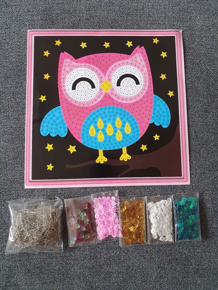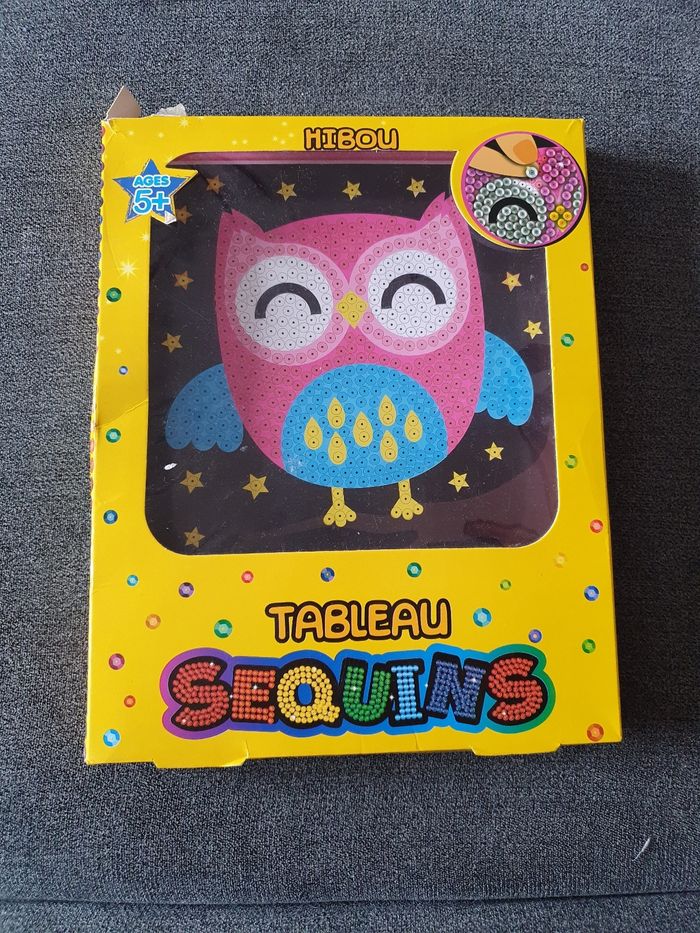 A vendre Tableau sequin hibou. Tous les sequins et les clous sont présents mais il manque le support en polystyrène. N'hésitez pas à jeter un coup d'œil sur mon dressing (d'autres jouets / jeux en vente). Une réduction dès 2 articles achetés !