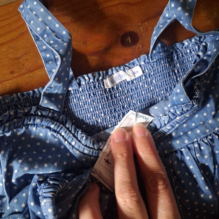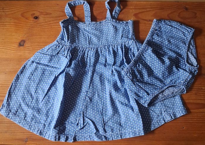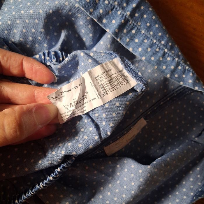 Robe bleue a pois blanc + culotte qui peux retenir la couche. Etiquette compo de la robe découpée