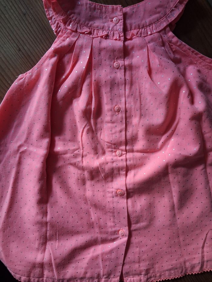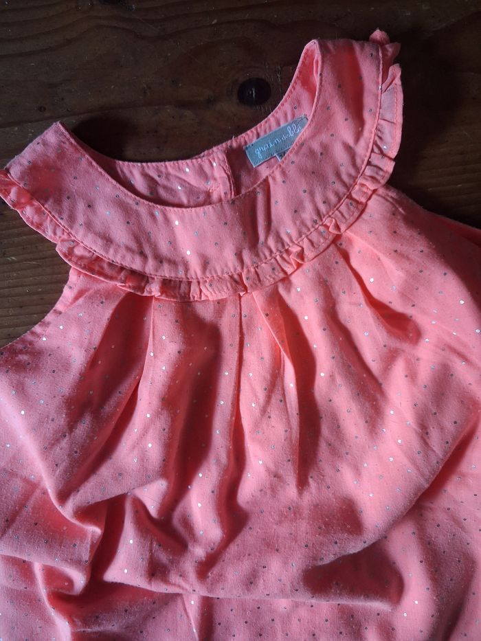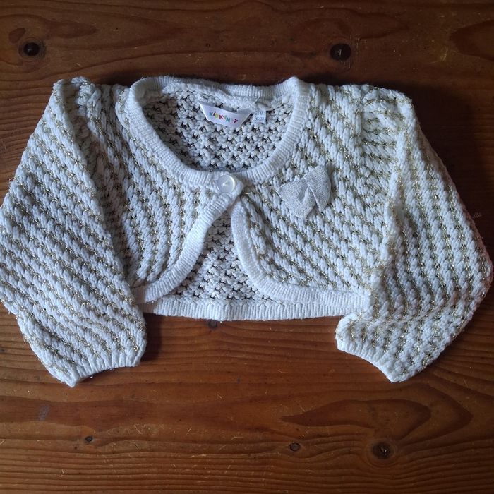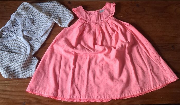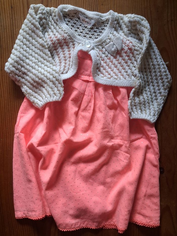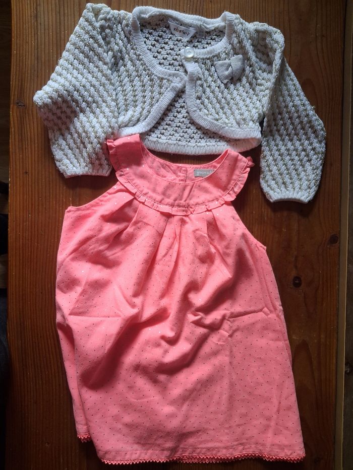 Robe fille rose a pois argenté de Grain de Blé + bolero blanc avec des fibres doré de Kidkanaï La robe est en bon état général mais le boléro a quelques accros au bras et derrière.