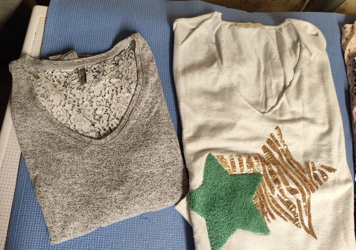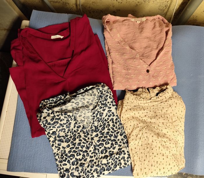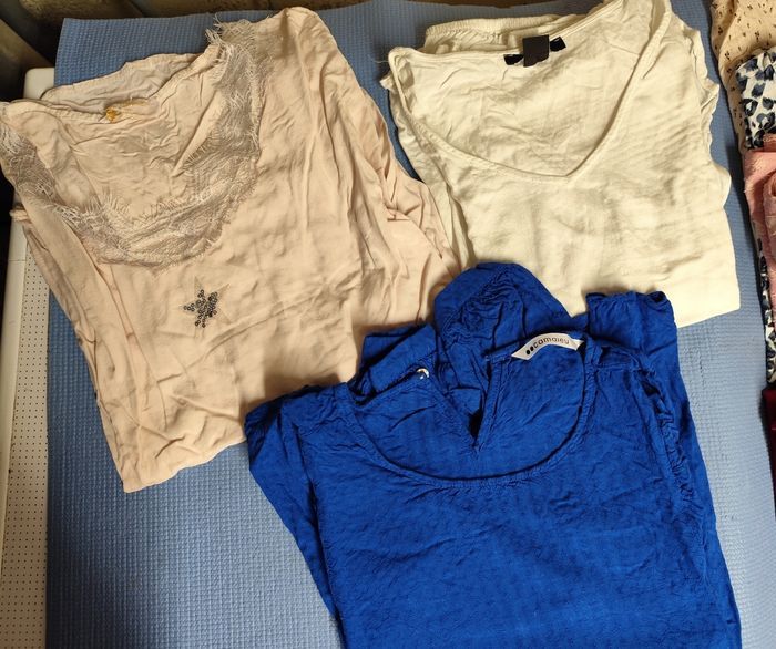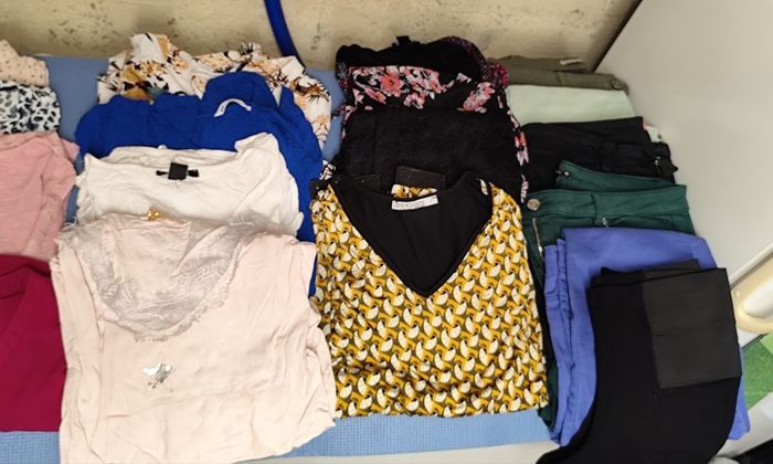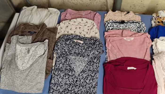 Lot femme taille 40/42. Il comprend pantalons, pantalons 3/4, robes, pulls, veste, tuniques, chemisiers Prix négociable