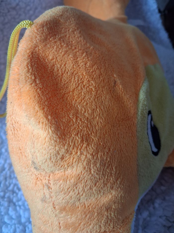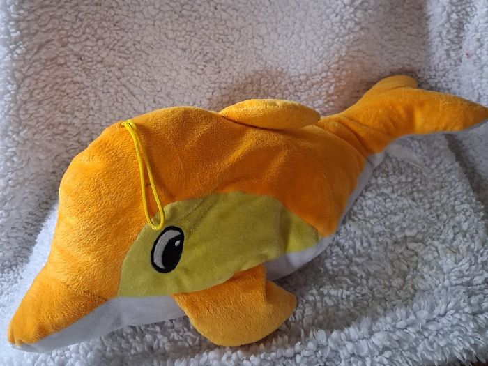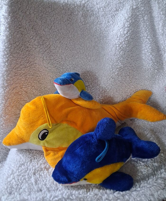 3 Peluches dauphin 🐬 en bon état général juste 2/3 toutes petites tâches sur la tête du dauphin orange et jaune