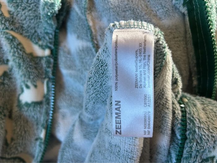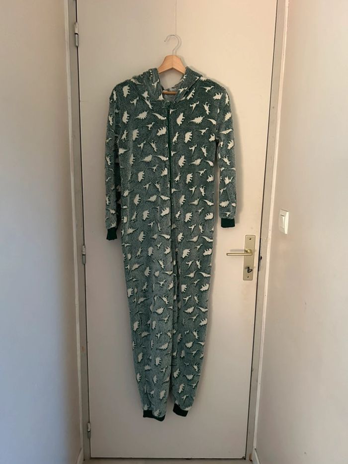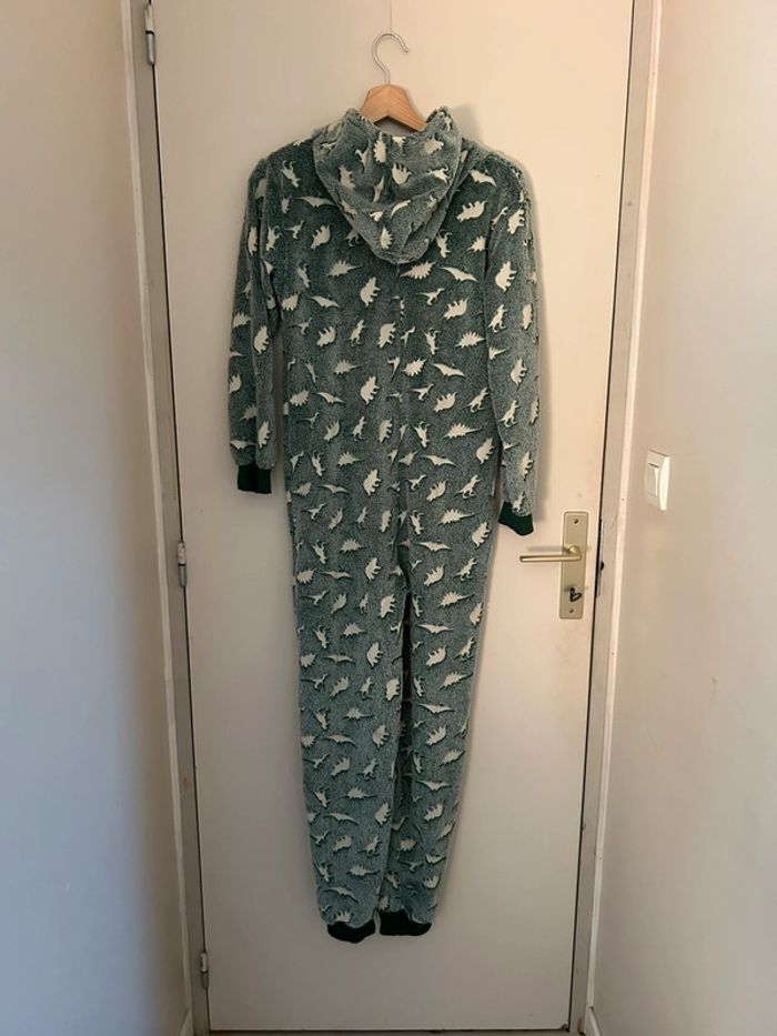 Combinaison pyjama sur le thème des dinosaures 🦕 🦖, dinosaures qui brillent dans le noir, en pilou-pilou, avec fermeture à glissière, couleurs vert et crème, de la marque Zeeman Matière polyester Taille 158-164 ( équivalent 12-14 ans) Très bon état #sabiide35garçontaille14ans #sabiide35garçontaille12ans