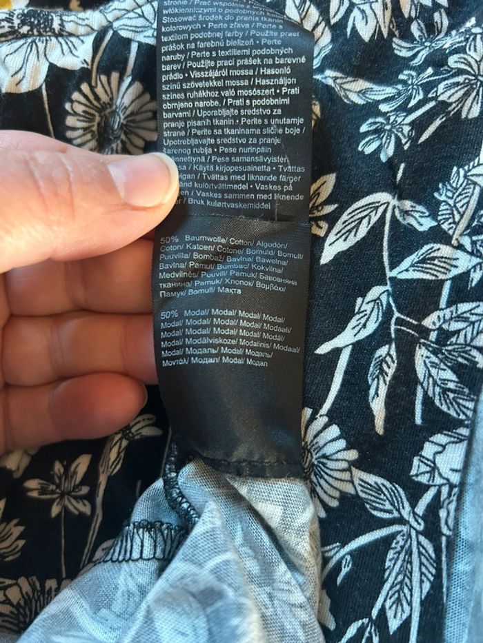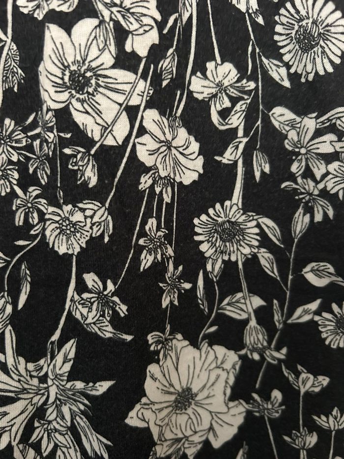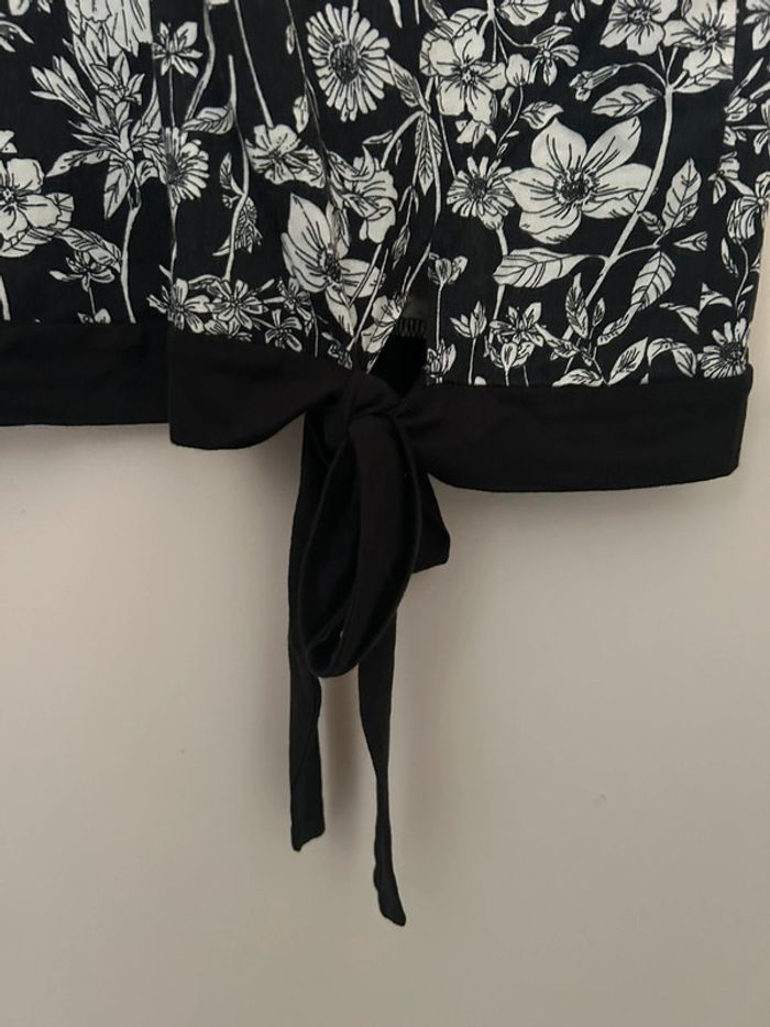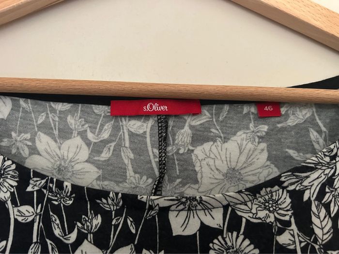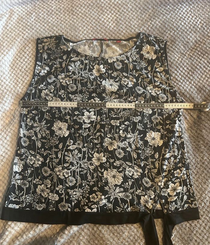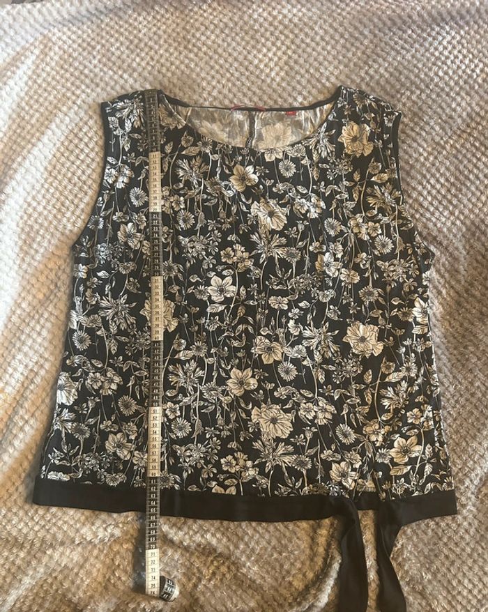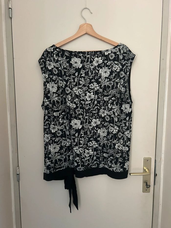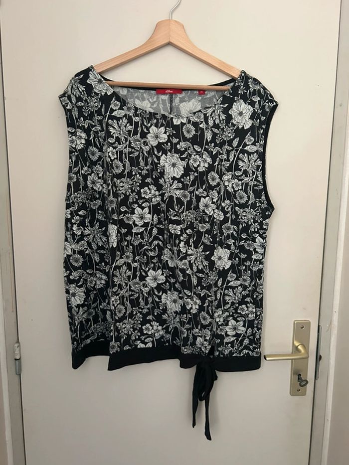 Débardeur fleuri, avec liens dans le bas à nouer, couleurs noir et blanc, de la marque S.Oliver Matière coton et modal Dimensions aisselles à aisselles : ~ 57,5cm Dimensions en longueur : ~ 65,5 cm Taille 46 Bon état (porté plusieurs fois) #sabiide35femmetaille46