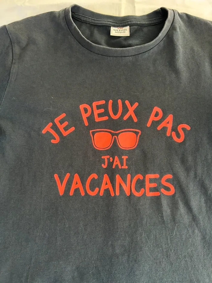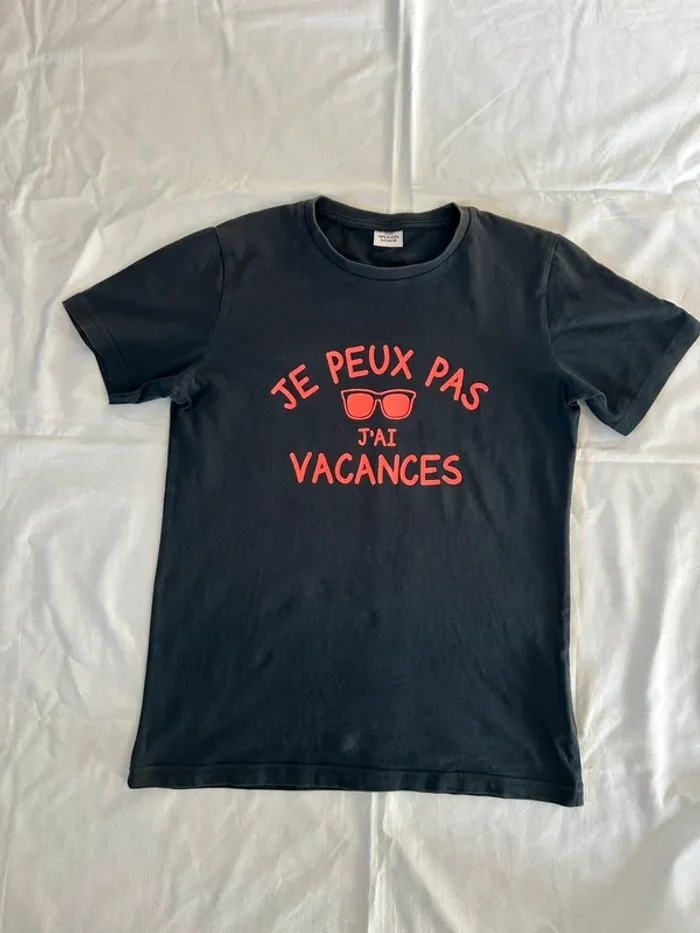T-shirt MC à message, couleur bleu marine et écriture en corail fluo, de la marque Tape à l’œil (TAO) Taille 14 ans Très bon état (sauf col décoloré surtout à l’arrière mais cela reste discret, cf photos) #sabiide35garçontaille14ans