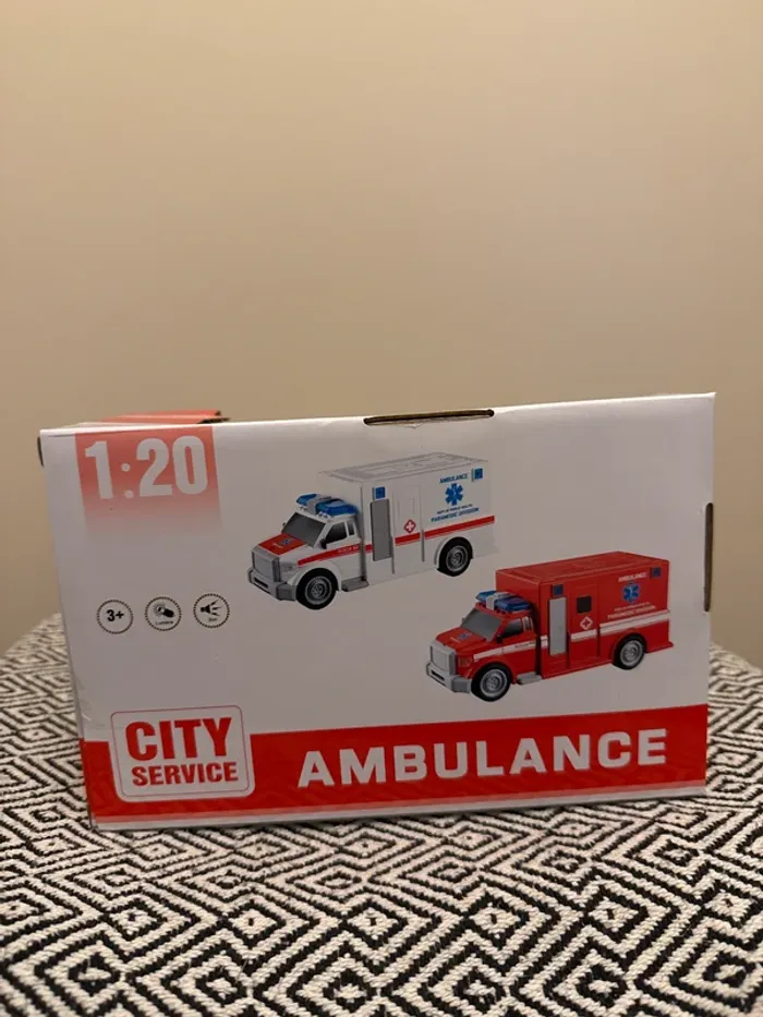 Vendeur professionnel Ambulance à l'échelle 1/20eme avec effets sonores et lumineux. Alimentation 3 piles LR44/AG13 fournies. 31,5 x 12 x 17 cm Référence A2100876 À partir de 3 ans Expédition rapide et soignée
