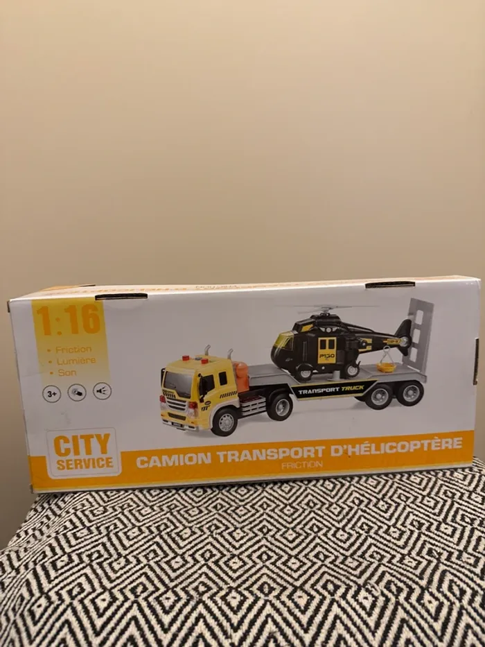 Vendeur professionnel WDK Camion transport hélicoptère sons et lumières : camion plateforme à friction transportant un hélicoptère pourvu d'un treuil et d'une barquette. Sons de klaxon, moteur, marche arrière. Effets lumineux. Échelle 1/16ème. Longueur du camion : 38 cm. Référence A2002957 À partir de 3 ans Expédition rapide et soignée
