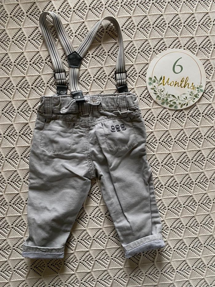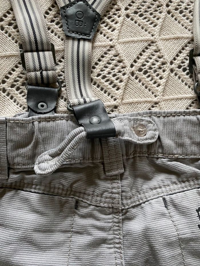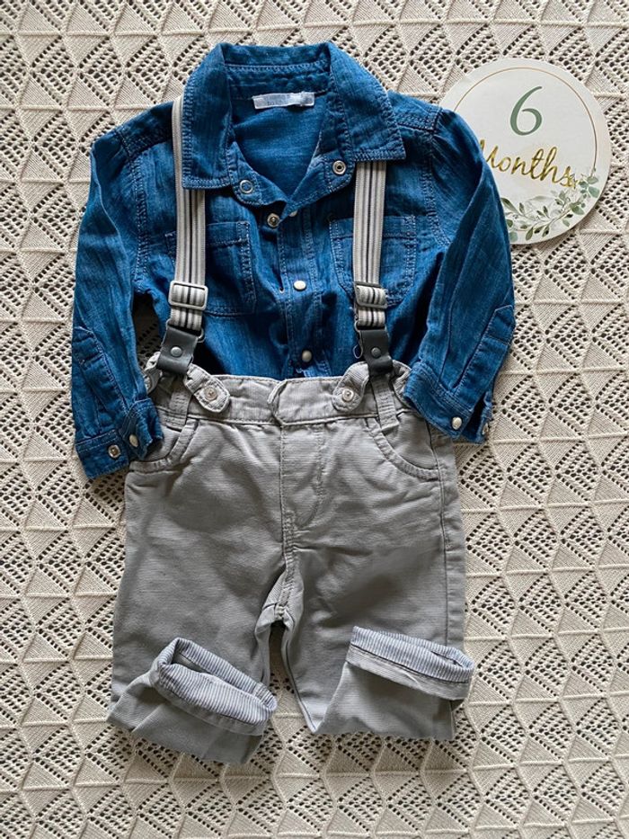 Pantalon okaidi avec bretelles (manque un bouton pour accrocher un bout de bretelle dans le dos) Chemise les essentiels de bout’chou