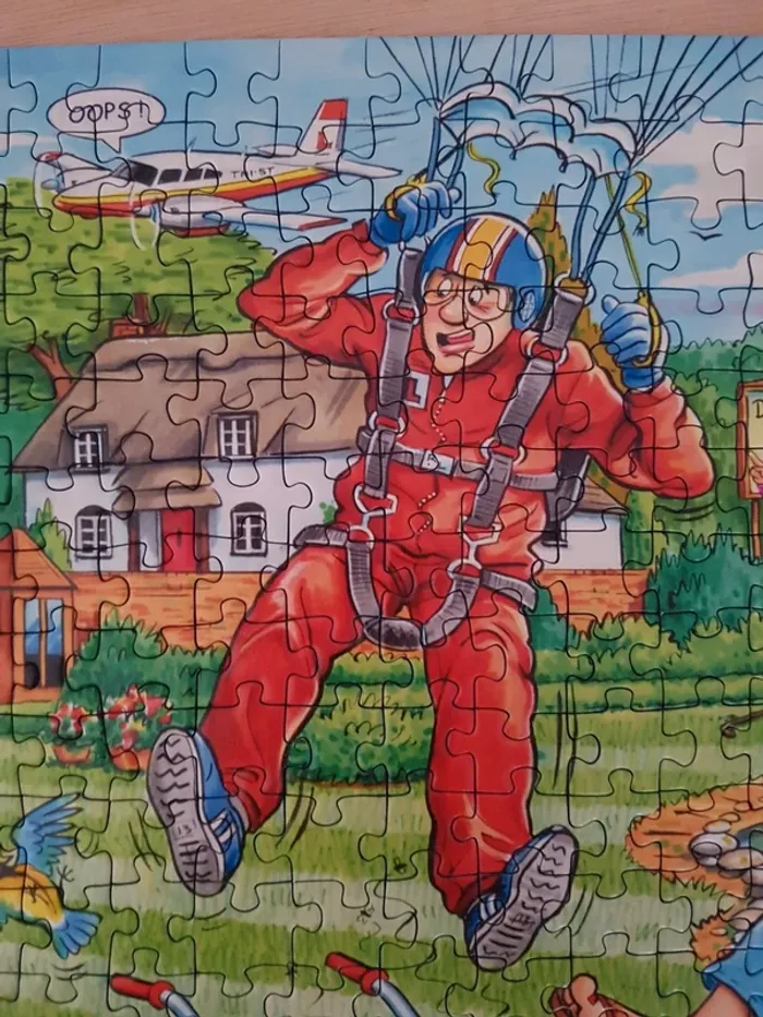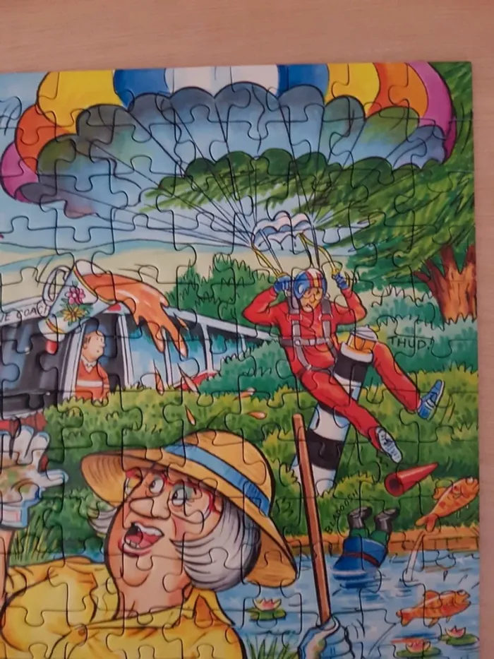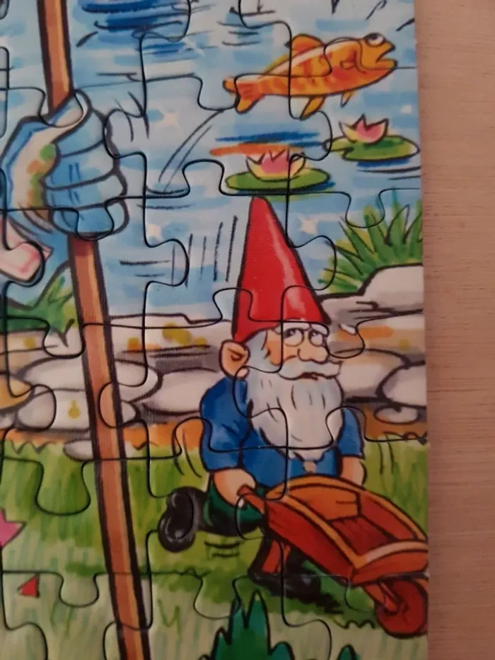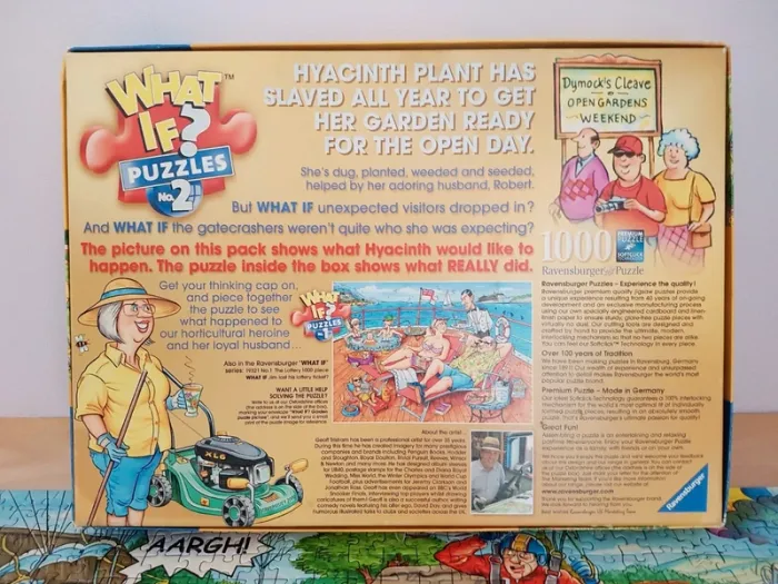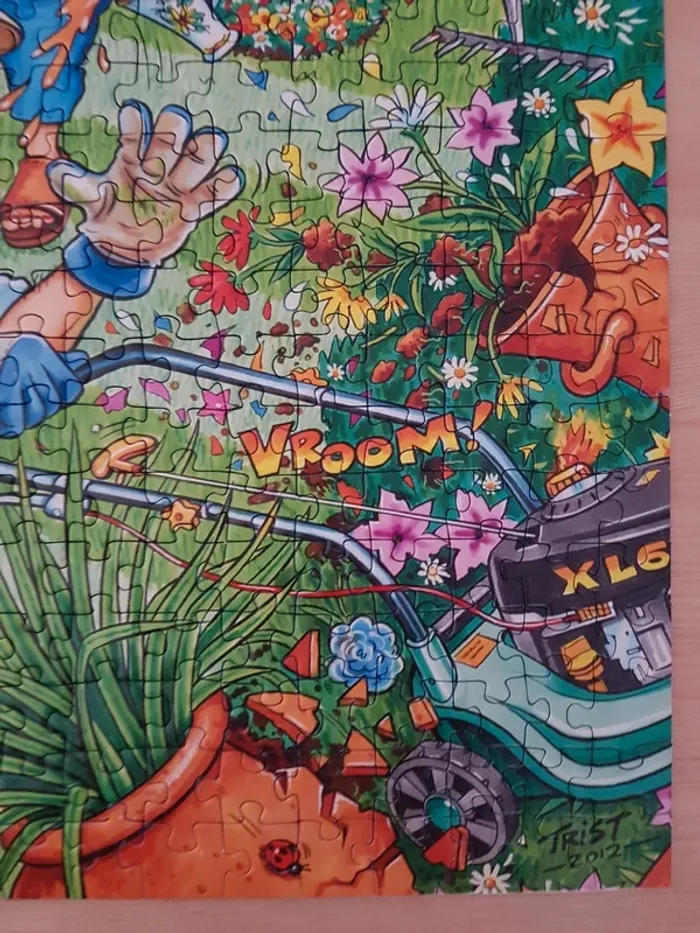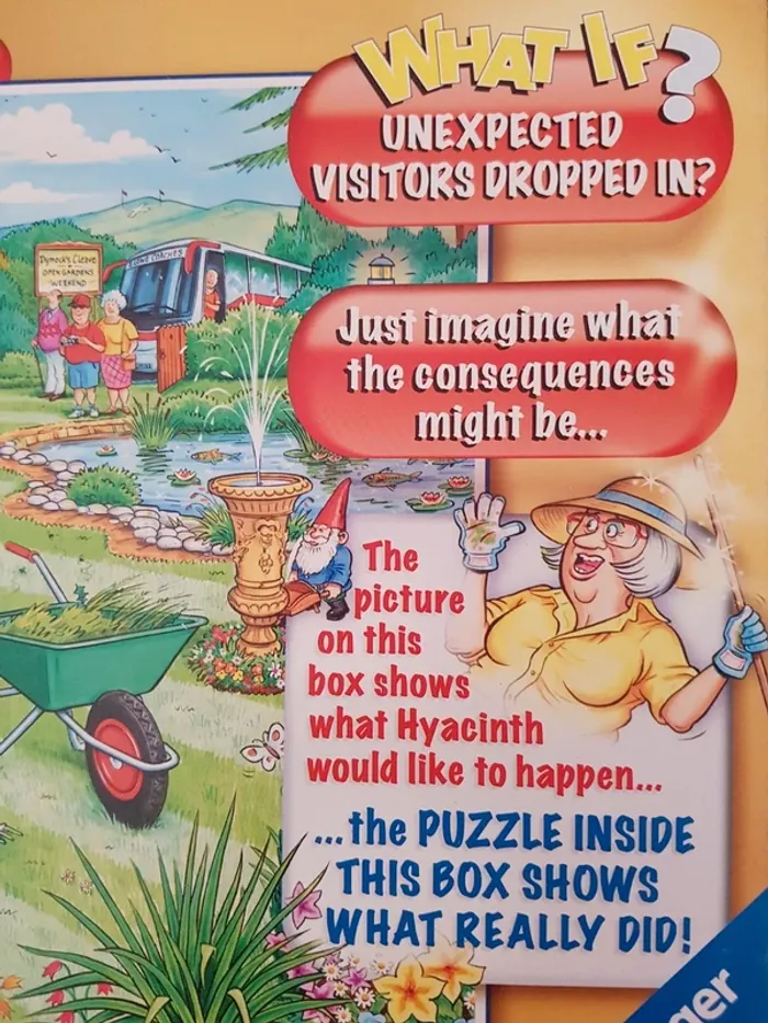 Un puzzle humoristiques et riche en détails (bus de vacanciers, nain de jardin, touriste, nichoir pour oiseaux, avion, mare, fleurs, maisons de campagne, chien ...) avec une touche de mystère.