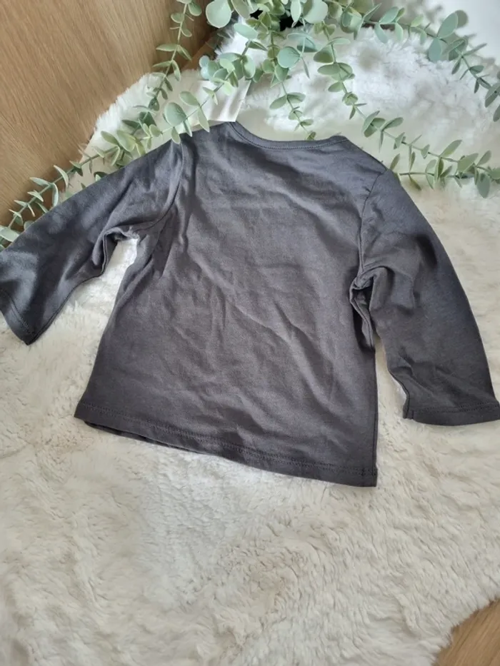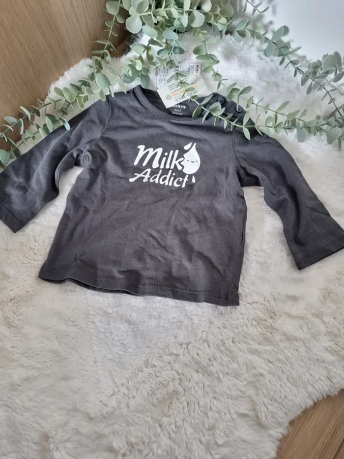 Neuf, tee-shirt manche longue gris anthracite. 6 mois, Kiabi Motif: "Milk addict" Mixte
