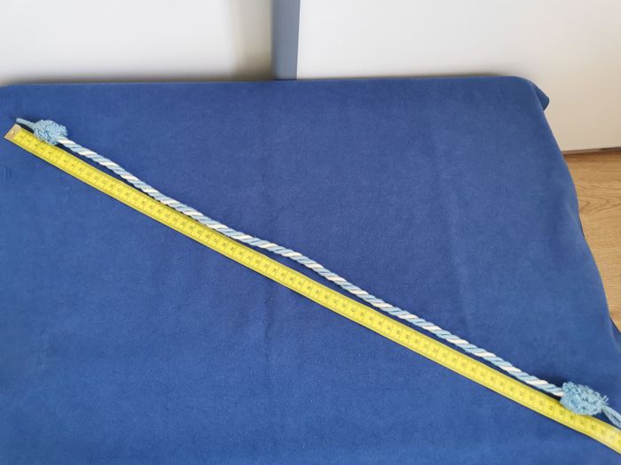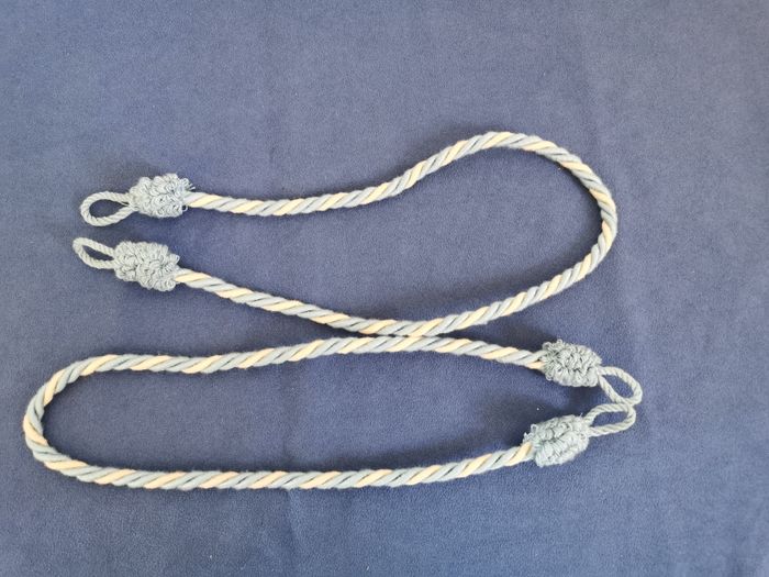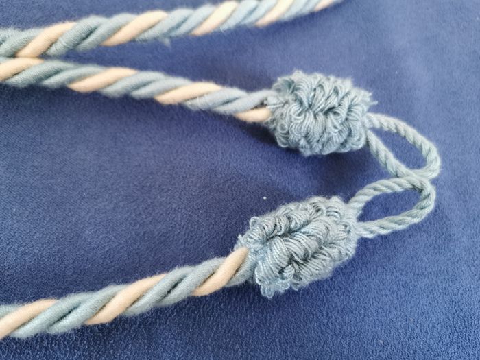 Lot de 2 embrasses de rideaux en corde torsadée bleu et écru. A chaque extrémité un pompon bleu et une boucle d'accroche. Longueur 70 cm Très peu utilisé, restent en très bon état. #embrassepourrideau #accrocherideau #cordonpassementerie #mar-taydeco #mar-taymaison
