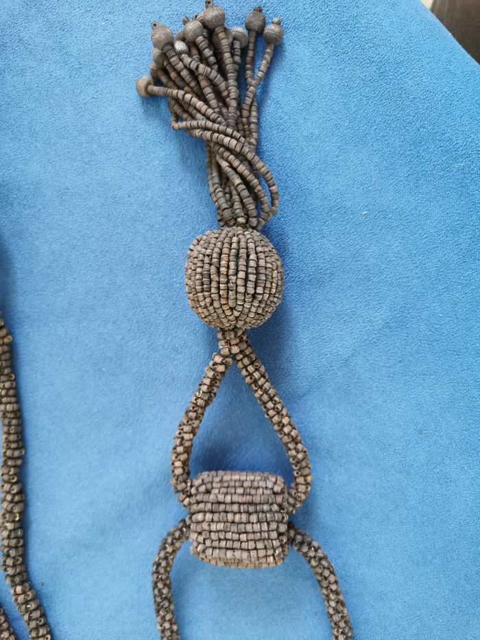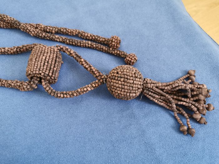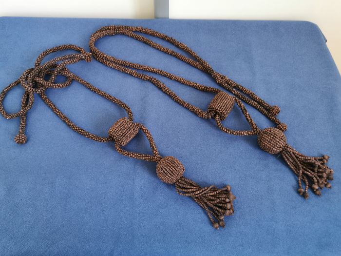 2 embrasses de rideaux en perle de bois marron foncé. Lien composé de petites perles assemblées pour former une corde. Elle est terminée par 2 petites boules de perles. Circule dans un manchon de 4 cm. De là, part la partie déco, avec une boucle se terminant sur une boule composée des mêmes perles bois et prolongée par plusieurs franges de perles. Look nature, ethnique Longueur du lien principal environ 140 cm Peu utilisées restent en très bon état. #embrassepourrideau #accrocherideau #embrassesbois #perlesdeboismarron foncé #couleurchocolat #mar-taydeco #mar-taymaison