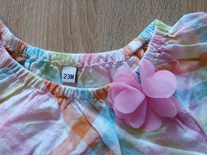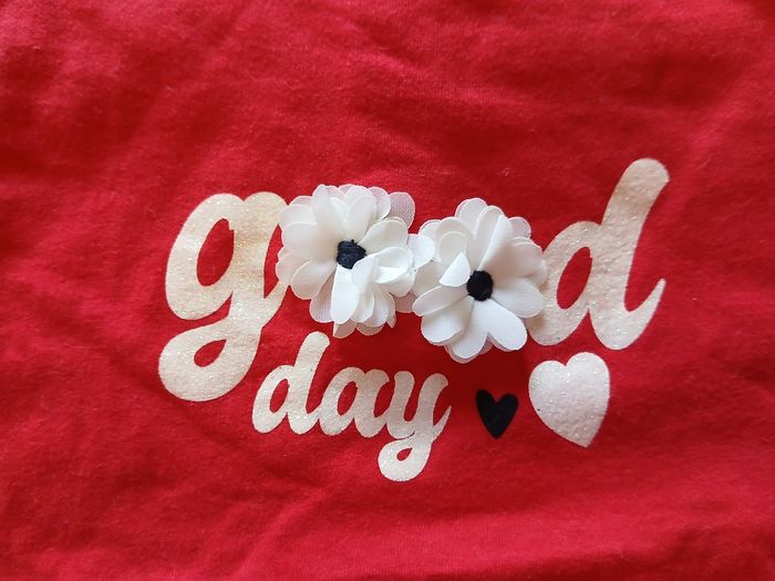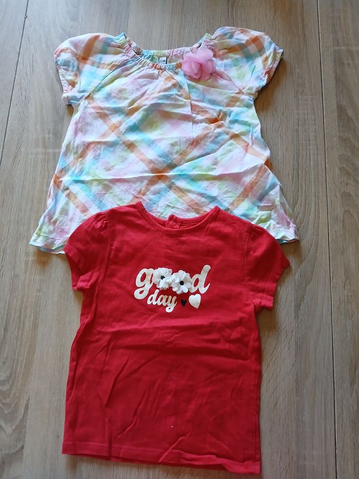Lot de 2 t-shirts à manches courtes : - 1 rouge fille, marqué "Good day", les "o" sont des fleurs avec les pétales en relief. Marque Kiabi. Taille 24 mois / 86 cm / 12 kg. Peu porté. - 1 très coloré avec des rayures dans les deux sens et une petite fleur rose sur la poitrine (a gauche). Taille 23 mois Les deux en très bon état