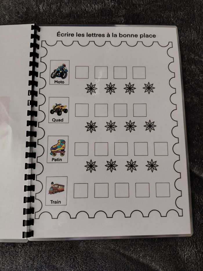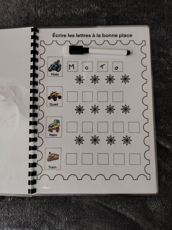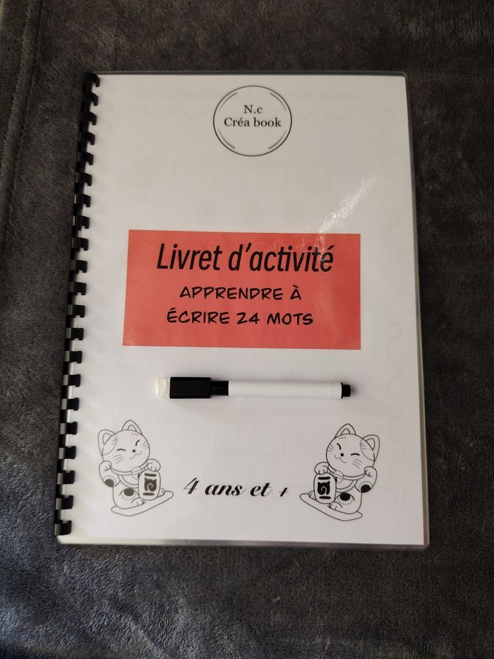 Livret d'activité apprendre à écrire 24 mots conçu pour les enfants vendu avec son feutres effaçables 6 pages complet