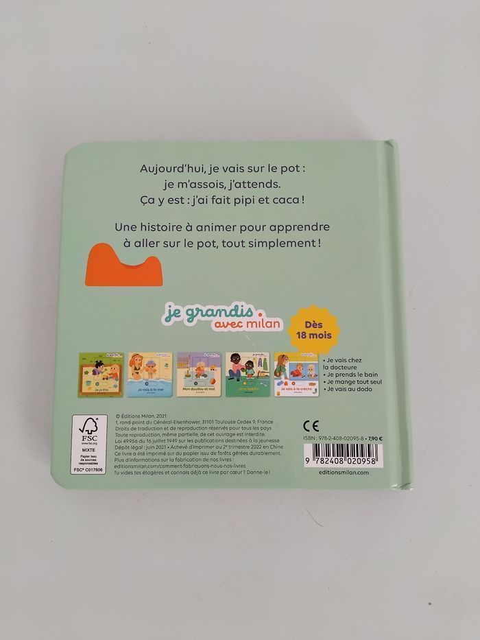 📚 Vends Livre pour Enfant, pour apprendre la propreté et l'usage du pot: Je vais sur le Pot, édition Milan. Livre d'apprentissage, aux pages épaisses cartonnées, avec volets à faire bouger à l'intérieur, pour expliquer les différentes étapes de l'usage du pot. 👍 Livre de seconde main, en Bon Etat, aucune page déchirée, voir les photos. 🛍 Groupez vos Achats et Cumulez les Promos! ✅️ Remise sur Lot Offerte dès le 2éme article, jusqu'à -10% ! 💌 Envoi rapide et soigné. 📦 Expédié en Points Relais. ✅️ Economisez -20% sur les Frais de Port Pour une livraison plus rapide, privilégiez Mondial Relay. Dépôt des colis au point relais du lundi au samedi. Rèf. Annonce: JVSLP- A423 MILAN - Je vais sur le Pot - Livre Apprentissage Propreté Bébé Enfant