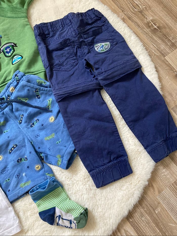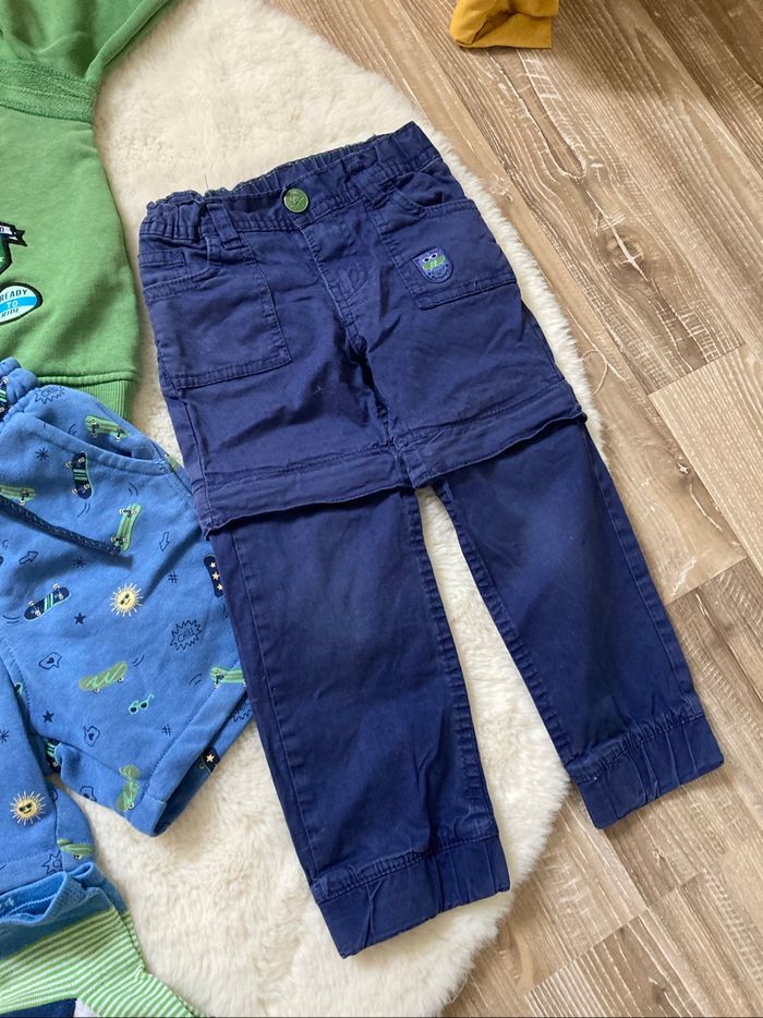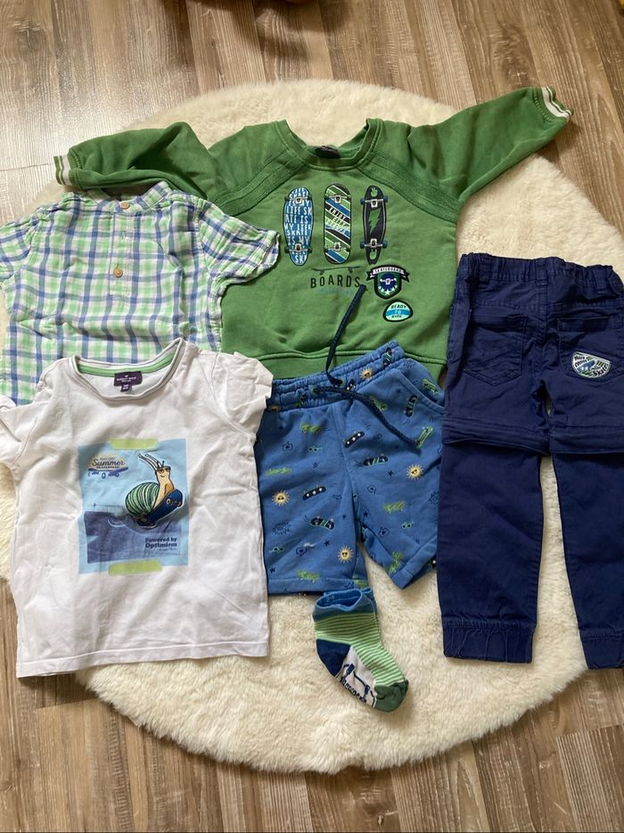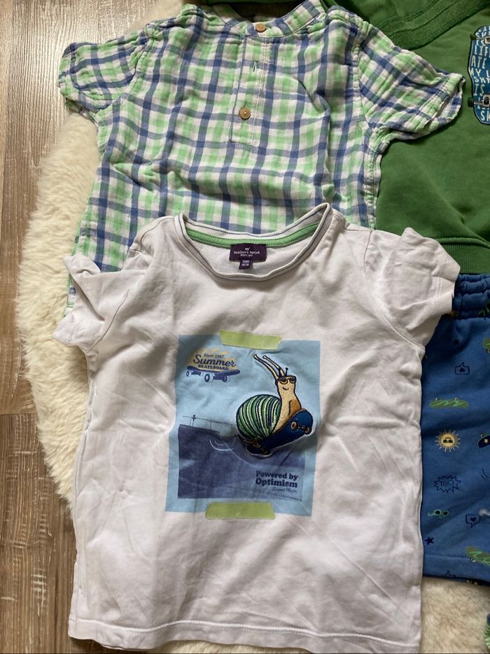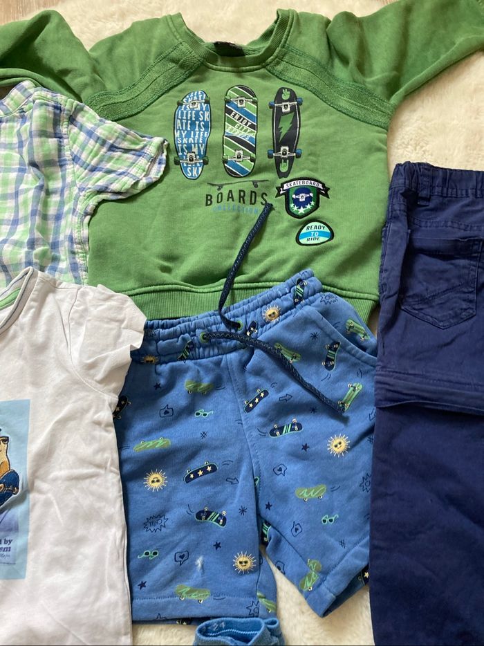 Lots de vêtements d’une même collection Haut en 3 ans Bas en 2 ans 1 chemise 1 tee shirt avec une petite tache cf photo 1 sweat 1 pantalon qui peut faire short 1 short