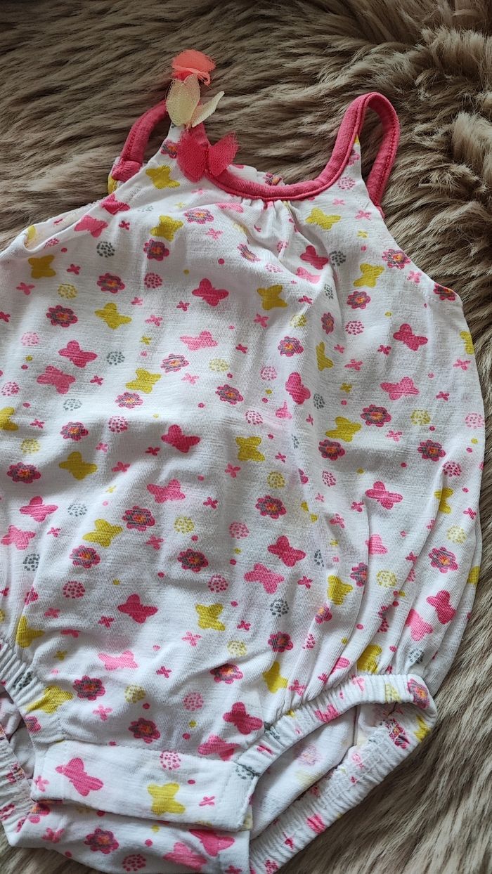 Barboteuse blanche avec papillons et fleurs rose, jaune et violet avec pressions dans le dos. De la marque orchestra En taille 1 mois En très bon état maison non fumeur #laetitia33700filleunmois