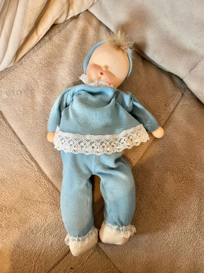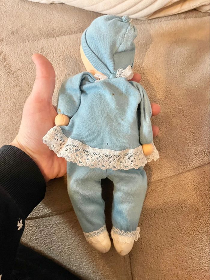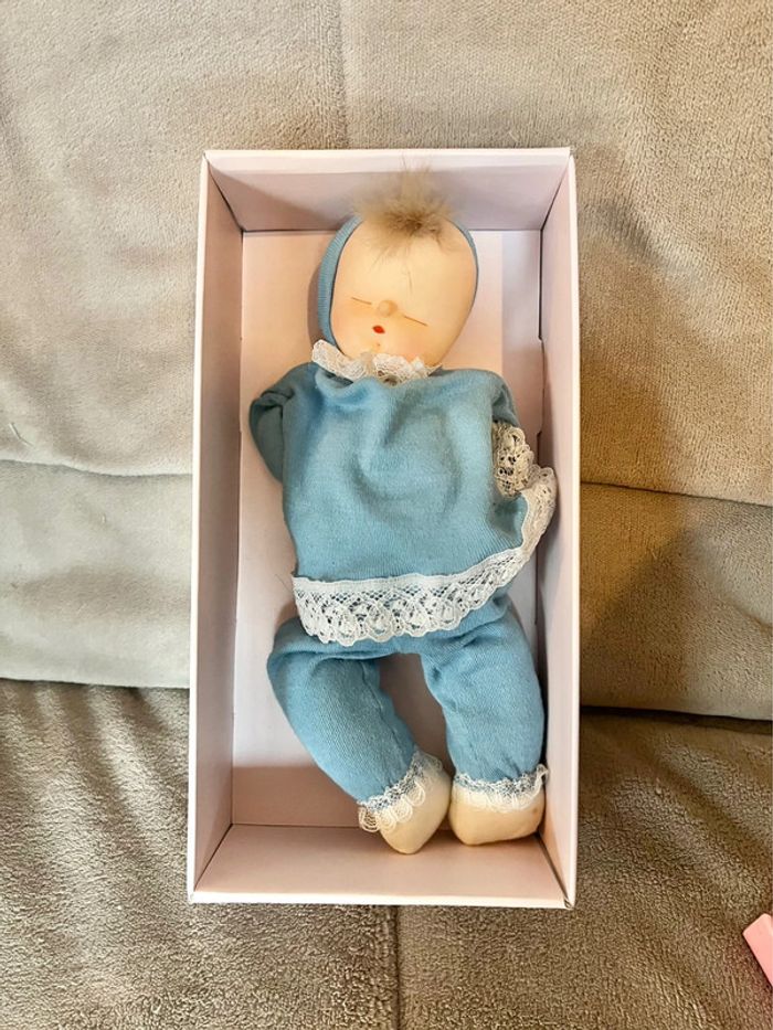 Je vends une vieille Poupée vintage shackman de 1959 de marque japonaise Bébé endormi avec musique qui le fait bouger En bon état : un trou et quelques taches sur le vêtements au dos
