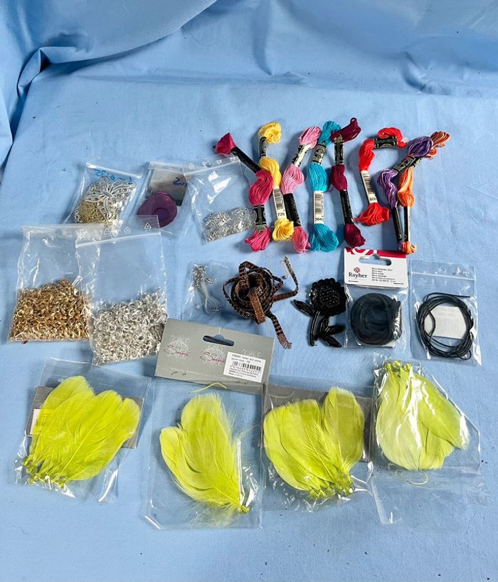 Je vends un lot de loisirs créatifs pour bijoux avec fermoir, perles, plumes,fils …