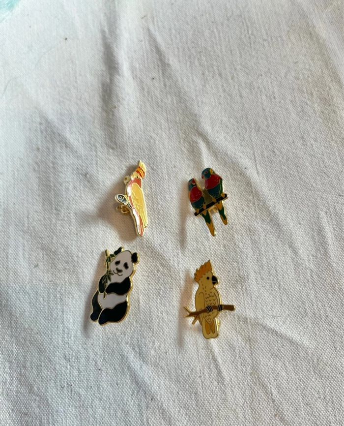 Je vends un ensemble de Pin’s et broches animaux : panda, perroquet/ oiseaux