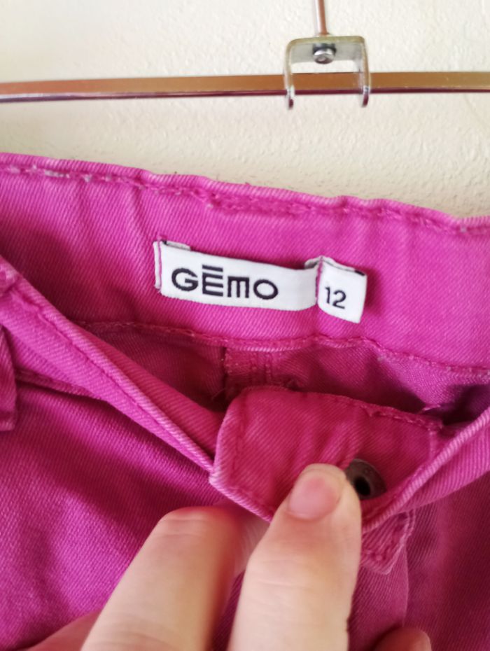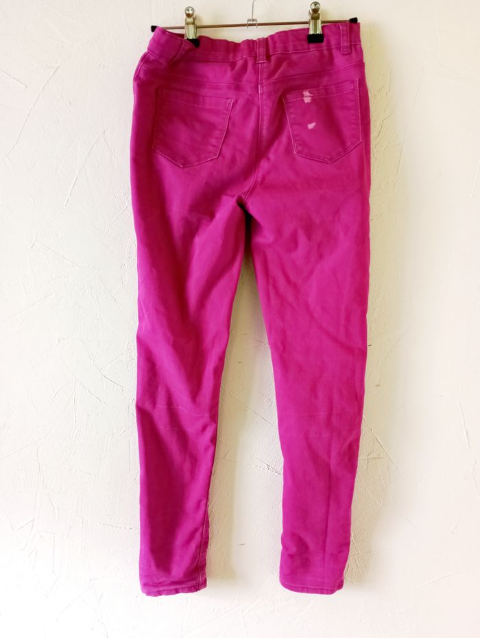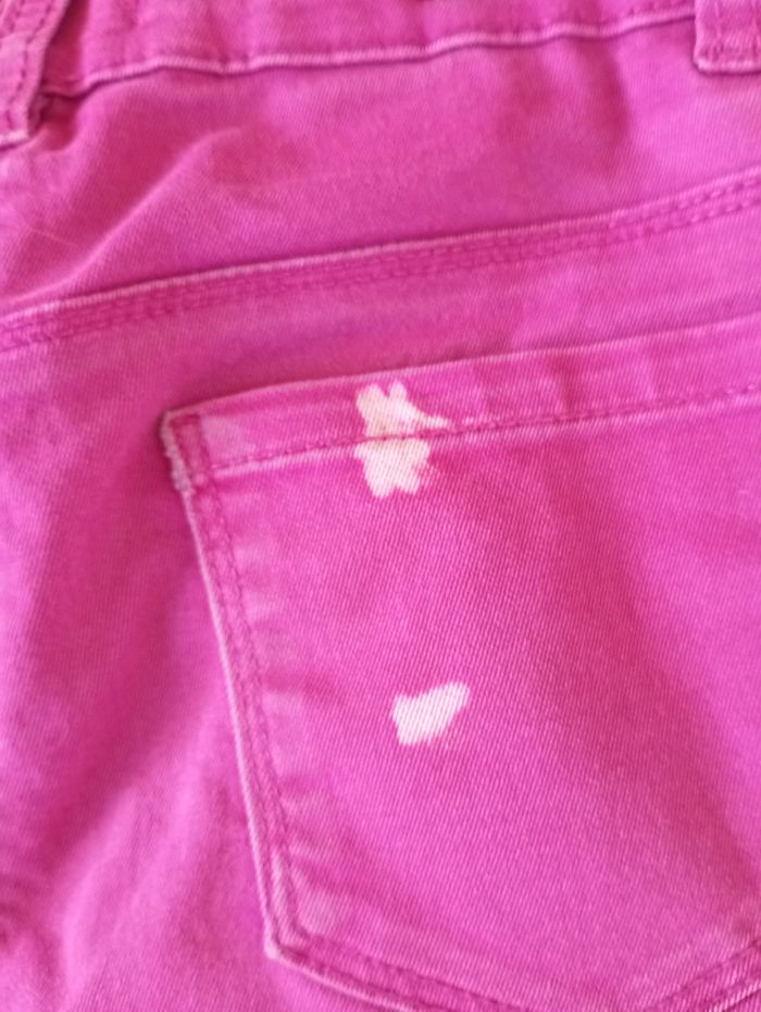 Joli jean violet mais avec tâches de javel sur une poche arrière ! Taille réglable à l'intérieur et se ferme par fermeture éclair + bouton pressions #nad43100habitsenfants