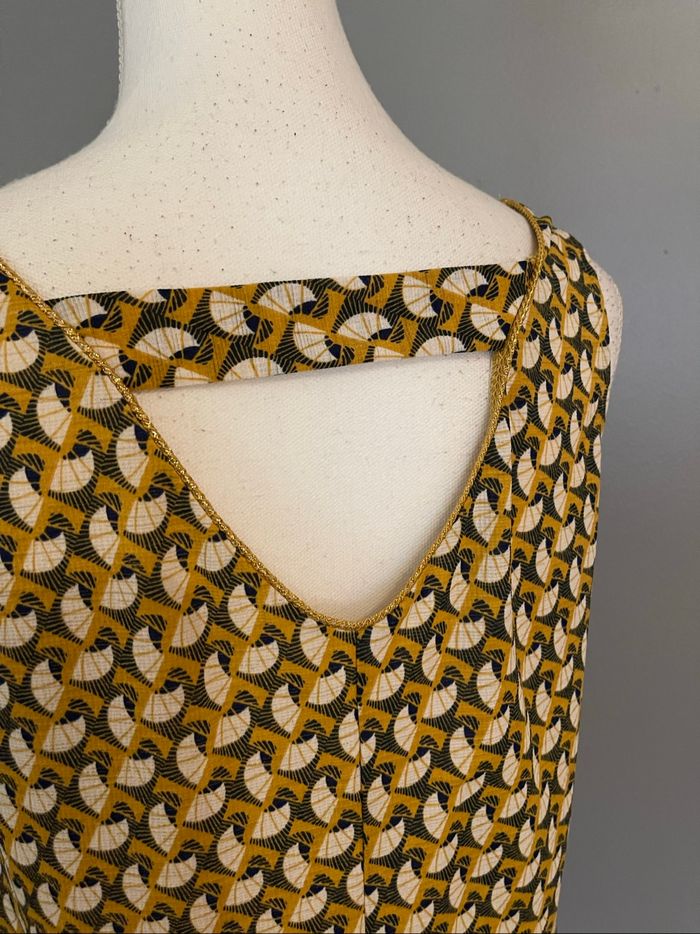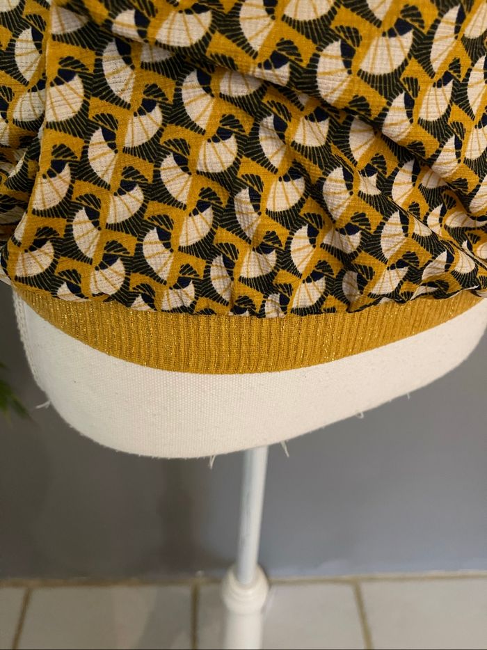 En très bon état, longueur 57 cm, taille élastique 39 cm, aisselle aisselle 44 cm, couleur moutarde, doré, crème et noir