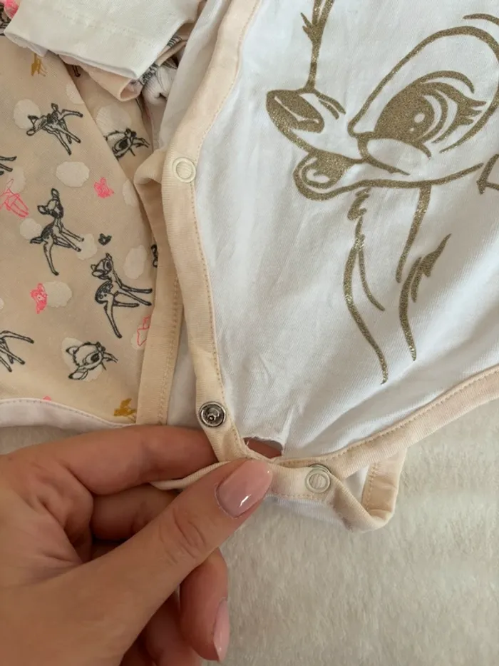 Lot de 3 bodies Bambi, porté quelques fois, taille correctement. Un des trois bodies a un petit trou au niveau des pressions du bas, mais ne gêne en aucun cas l’utilisation et peut être recousu.