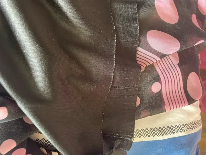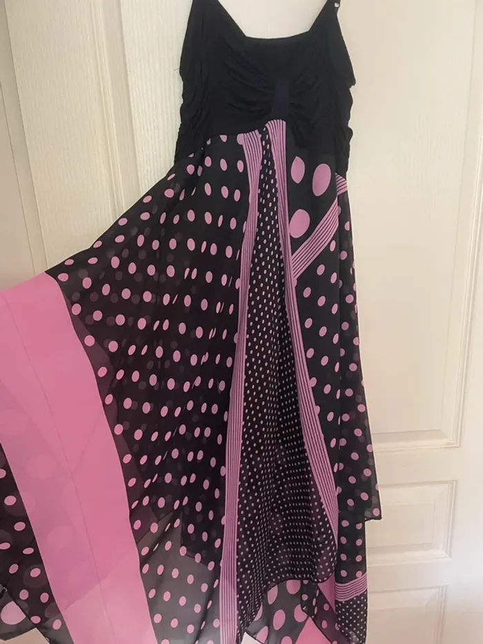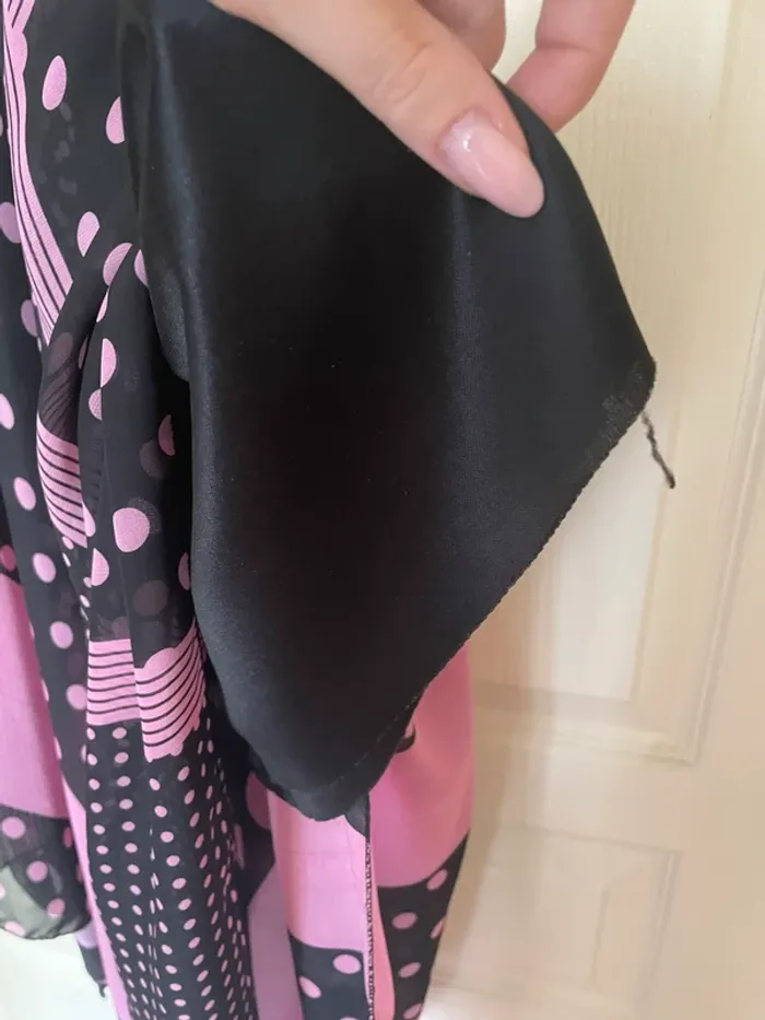 Porté quelques fois, taille correctement. Matière, très extensible au niveau de la poitrine, de la taille et de la doublure. Petits défauts sur la robe qui ne se voit pas forcément, quand elle est portée, ainsi qu’au niveau de la doublure.