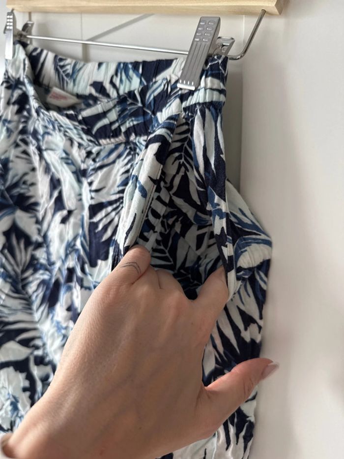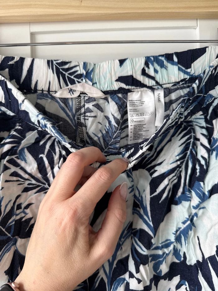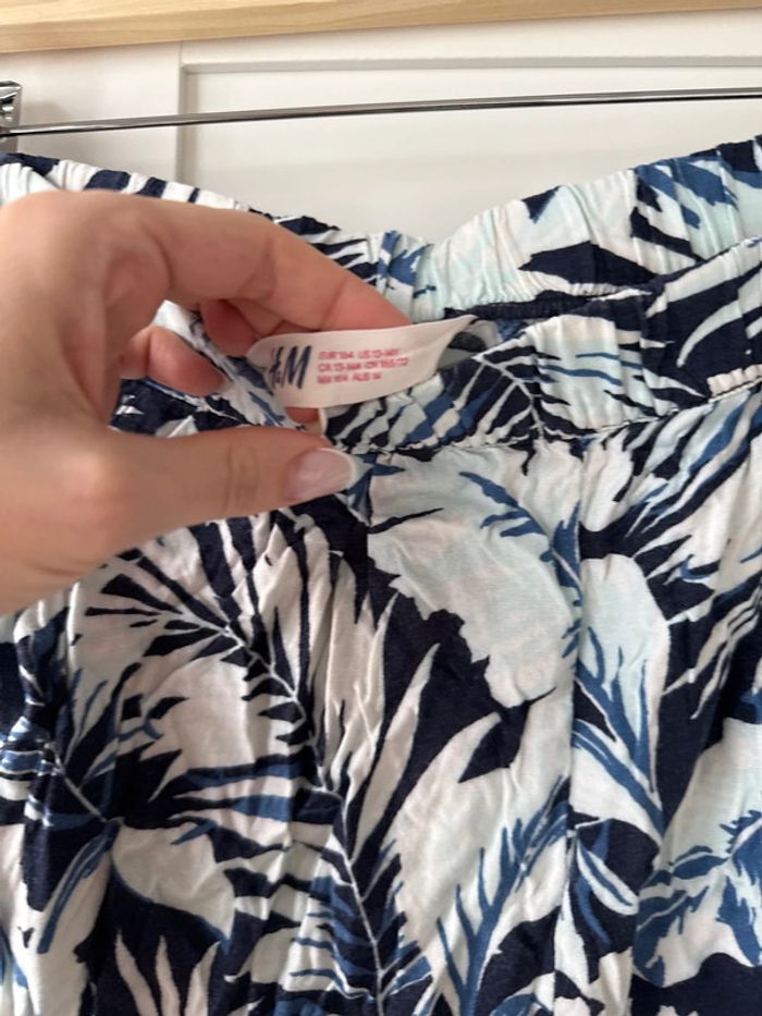 Sarouel H&M dessin de plante bleu 13-14 ans mais moi je fais 1m60 et je le porte je dirais une taille s en femme Les photos montrent l’état exact du produit désolé je ne suis pas adepte du repassage pour la vente
