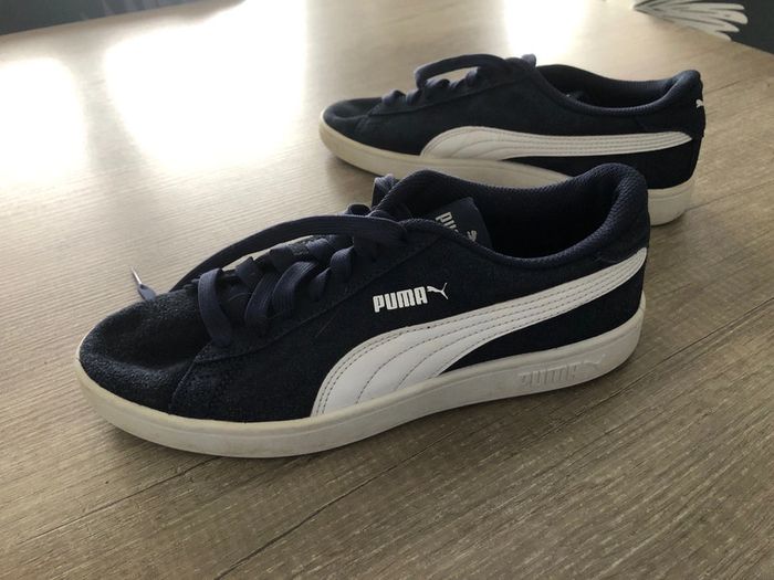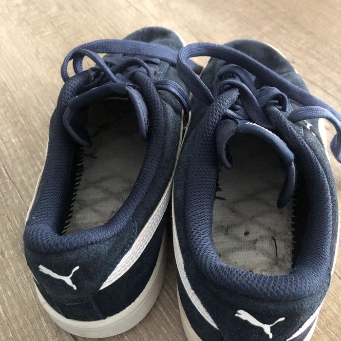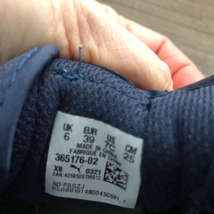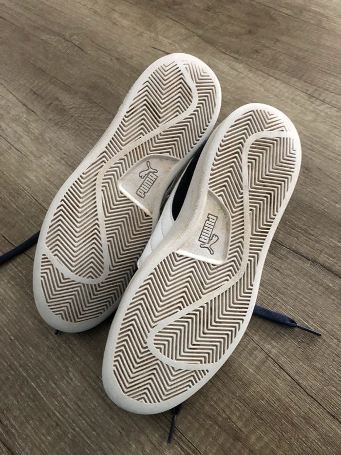 Puma, très bon état, peu portées. Manque la semelle intérieure car mon fils avait d’autres semelles à mettre La semelle intérieure n’est du coup pas déformée, il suffit de racheter une semelle neuve, d’où le bas prix.