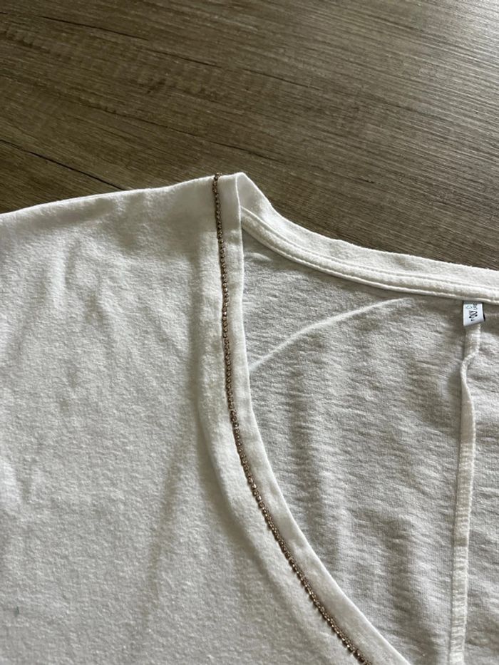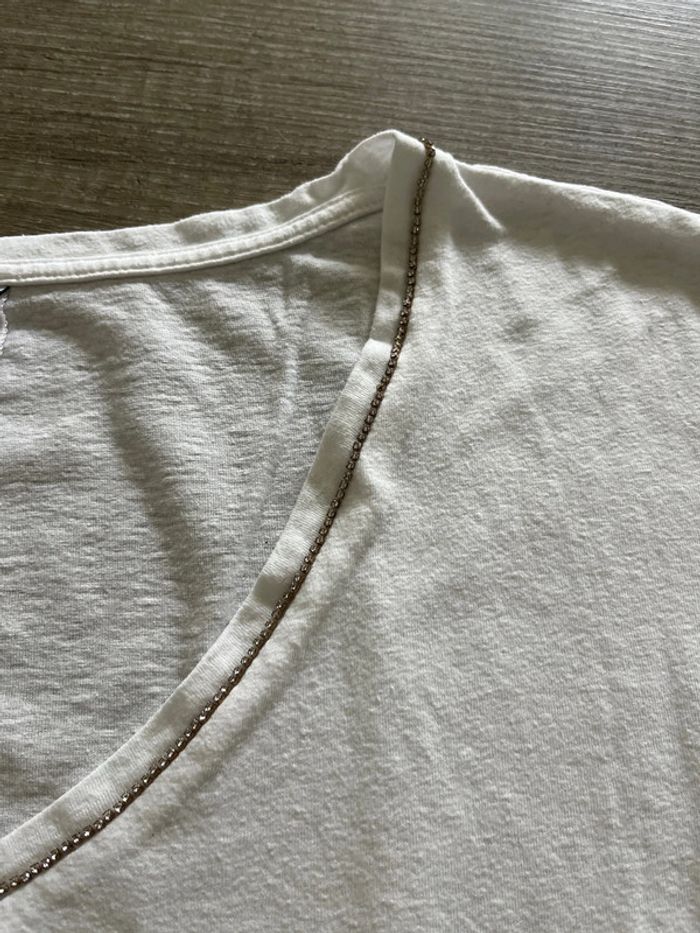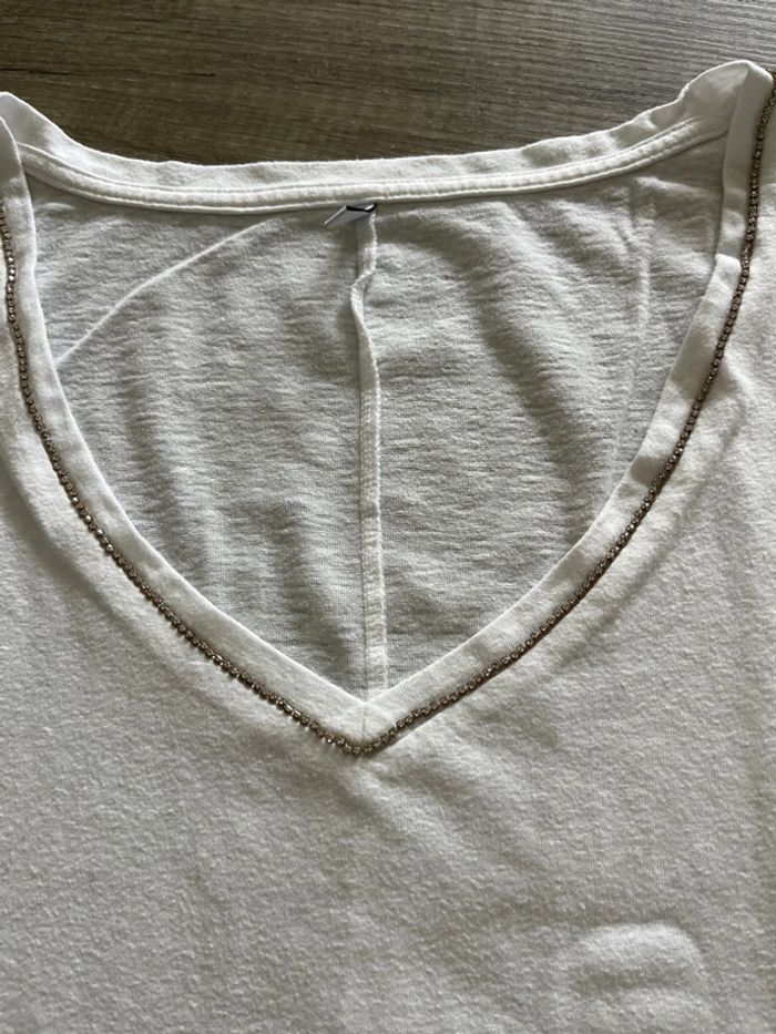 Joli t-shirt col en V bordé de strass. Aucun manquant. Blanc, très légèrement écru. #adultest67