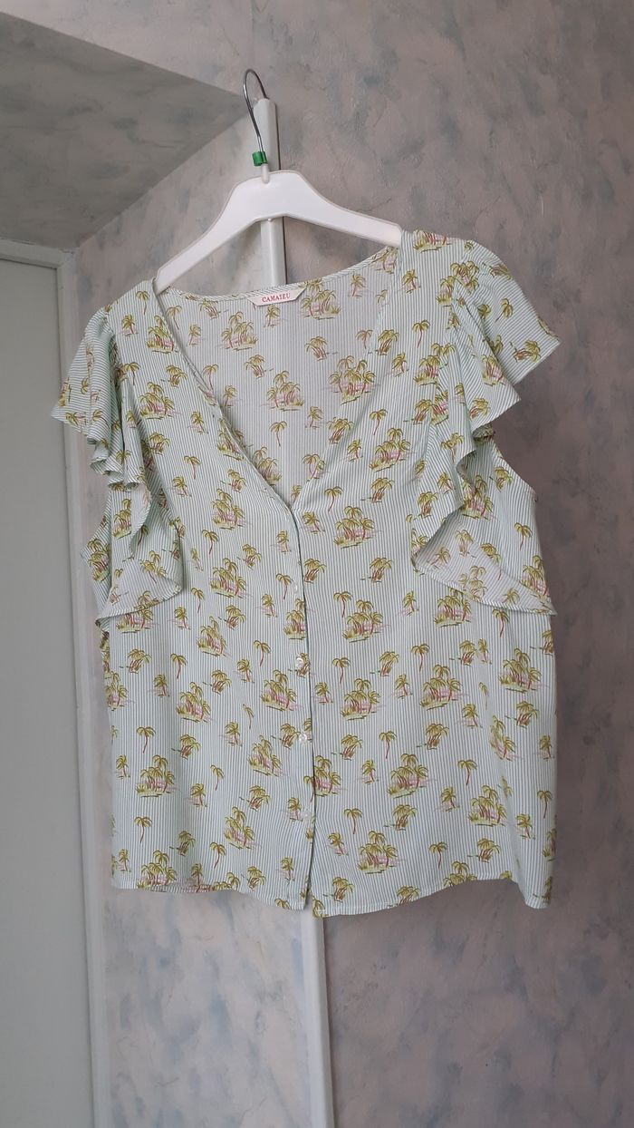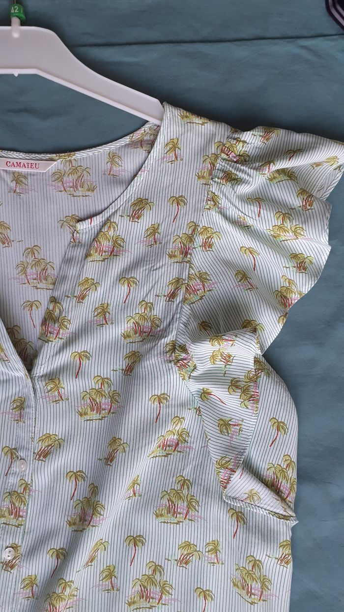Vends un chemisier sans manche avec volant sur emmanchures, en viscose, très frais, couleur blanc avec fines rayures vertes et fleurs moutarde, marque Camaïeu, taille 42. Longueur de l'épaule à la base : 56 cm Largeur aisselle à aisselle : 48 cm Largeur au niveau des hanches : 50 cm.