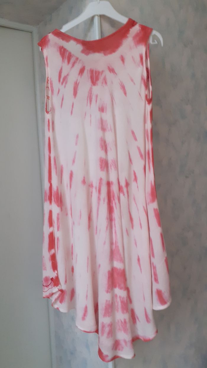 Vends une robe sans manche 100 % rayonne, forme trapèze et arrondie à la base, couleur blanc et corail, broderies rouge sur le buste, un peu transparente, marque J. D. Free Size, taille 42-44-46. Longueur de l'épaule à la base : 94 cm sur les côtés et 106 cm devant et derrière. Largeur la plus large aisselle à aisselle : 57 cm.
