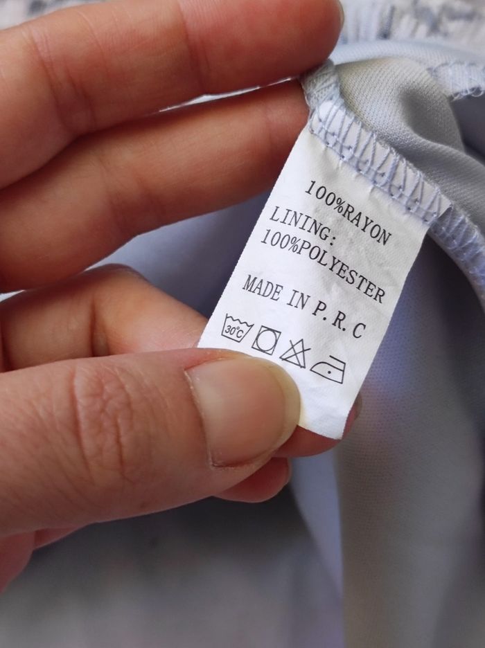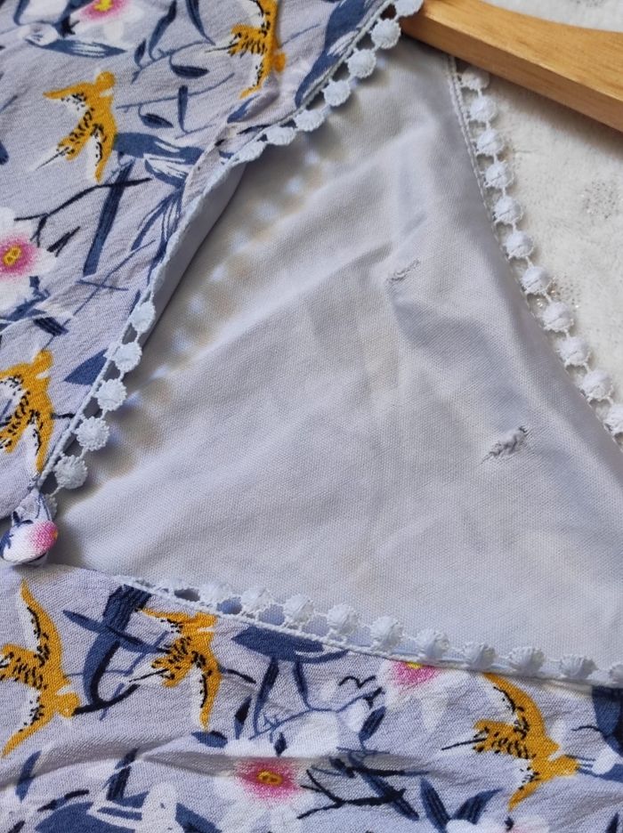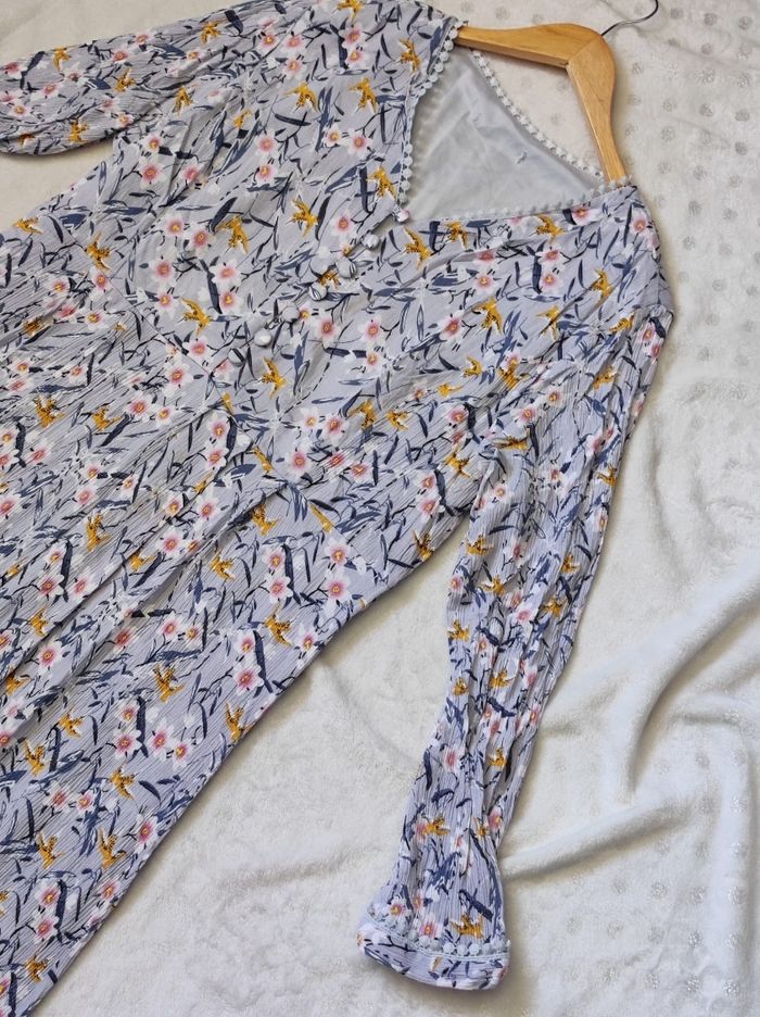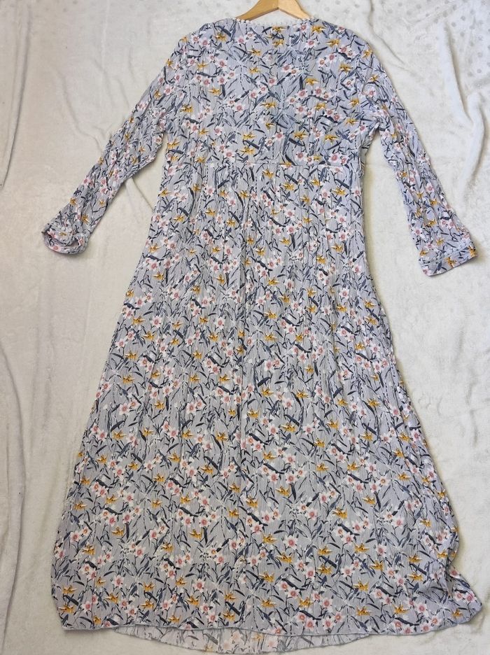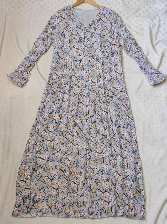 robe longue , doublée avec manches 3/4 et décolleté à boutons . Imprimé fleuri sur tons bleu/gris. Étiquette manquante mais c'est une taille 46/48. 100% rayon & polyester. En parfait état ( sauf l'endroit de l'étiquette arraché il y a deux trous ).