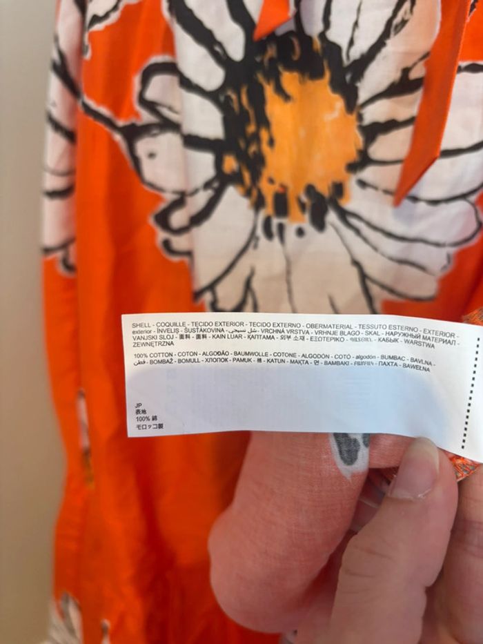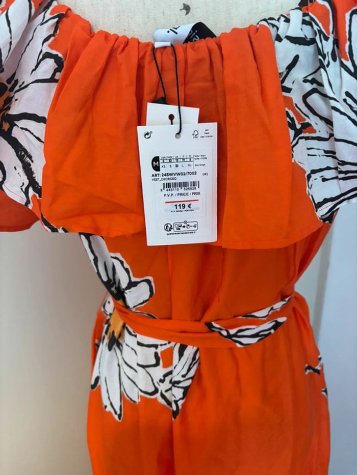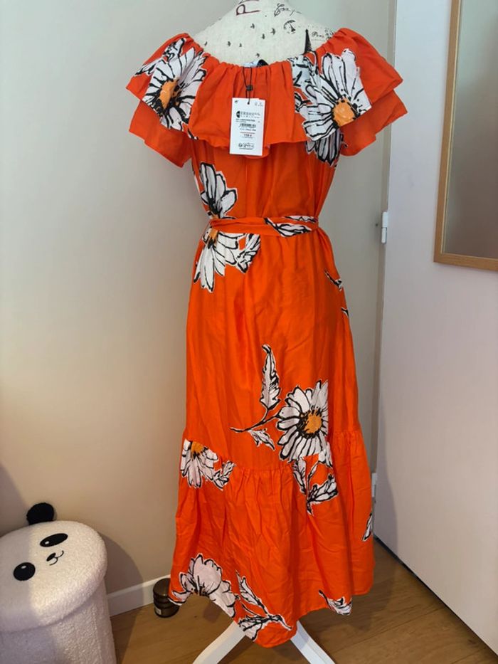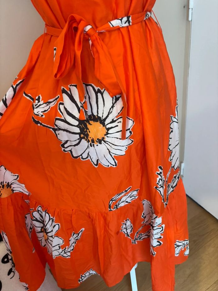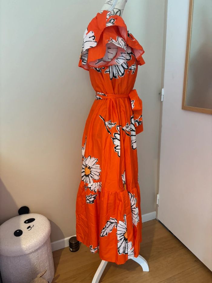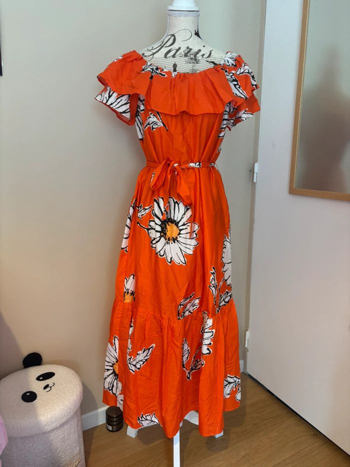 Neuve jamais portée avec étiquette d’achat. Superbe robe longue Desigual Orange à motifs fleurs marguerites Ceinture à nouer amovible À volants froufrous épaules dénudées Encolure bateau